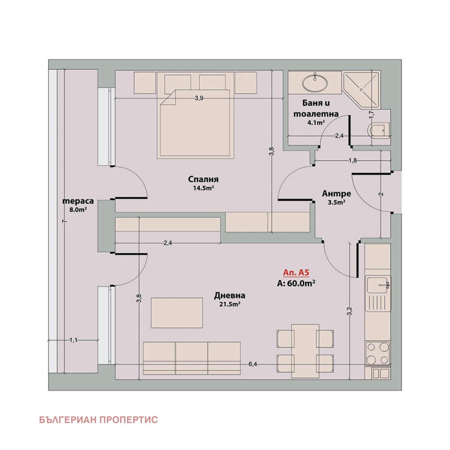 Апартамент A5 , обща площ 92.26 кв.м. (нетна площ 60.00 кв.м. + общи части 12.76 кв.м.), с допълнително пространство - тераса с площ от 19.50 кв.м. - .
