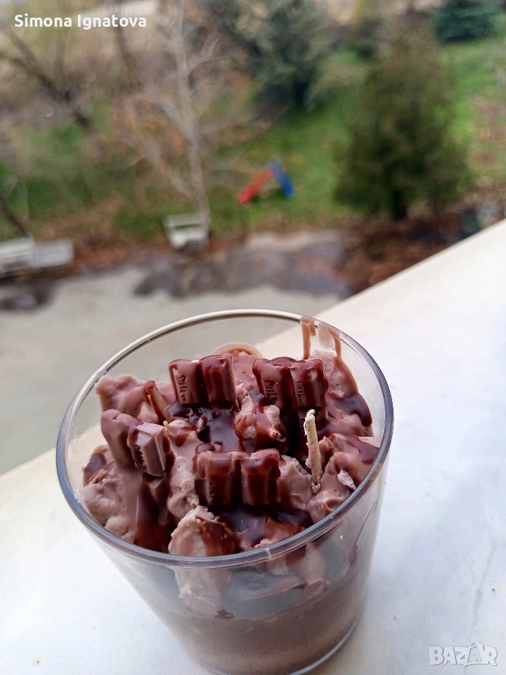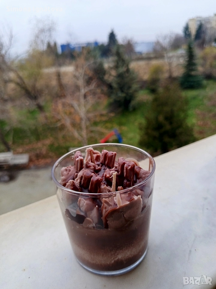 Ръчно направена свещ от 100 % соев восък под формата на шоколадов десерт с аромат на шоколад.