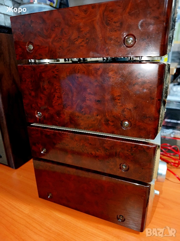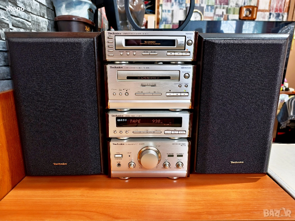 Модулна четири компонентна мини уредба свързване с лентови кабели,усилвател,тунер,eднокасетъчен реверсен дек с хоризонтално зареждане на касетката и пет 5 дисков ченджер свирещ само със оригинални CD дискове уредбата е Японска,а тонколоните са Испански