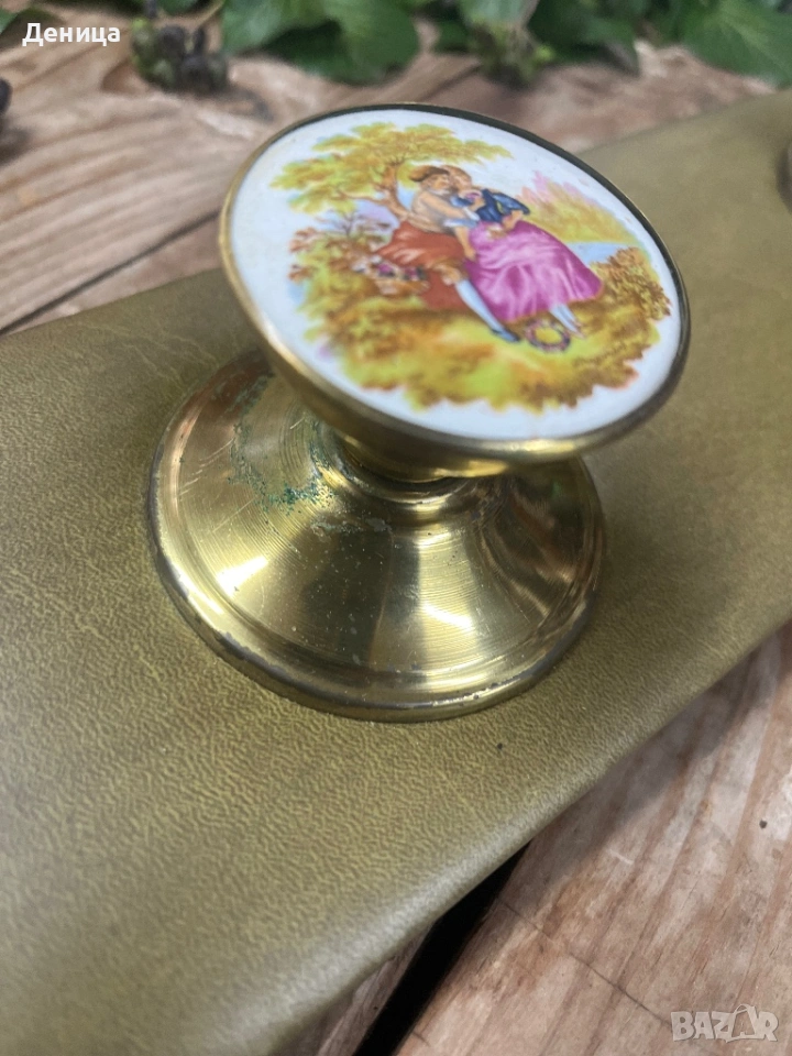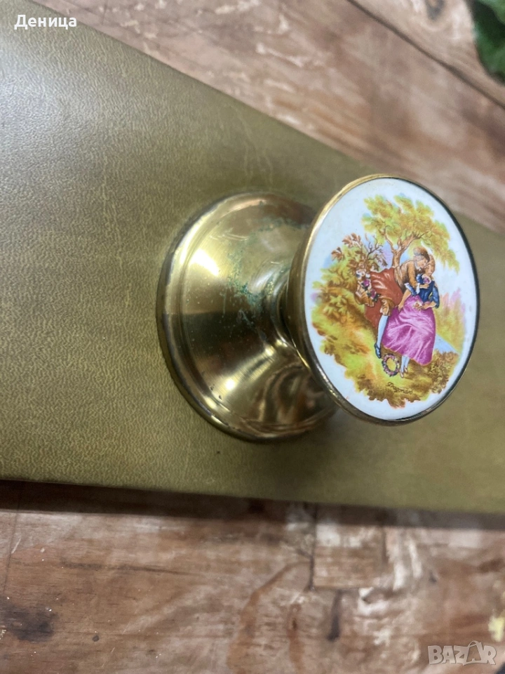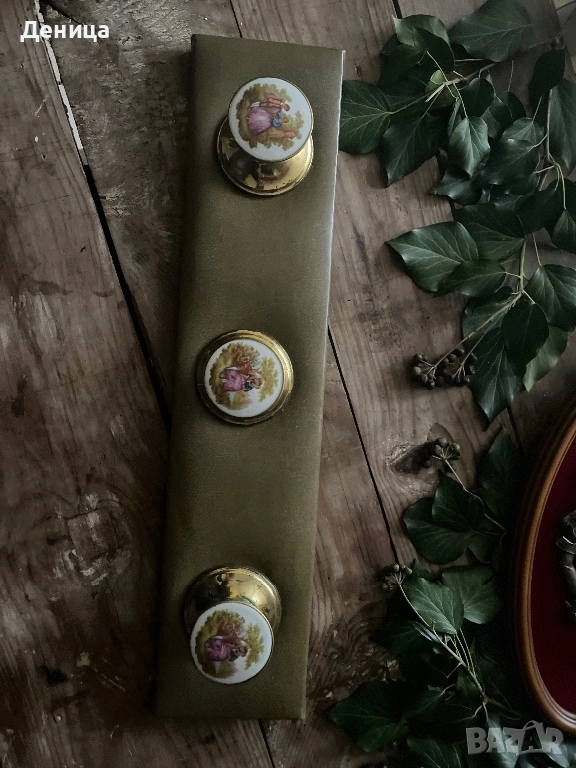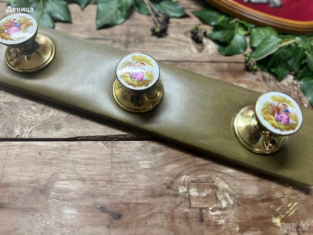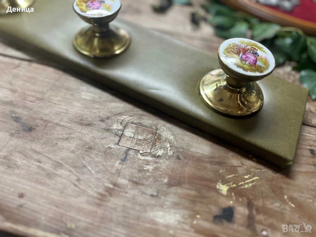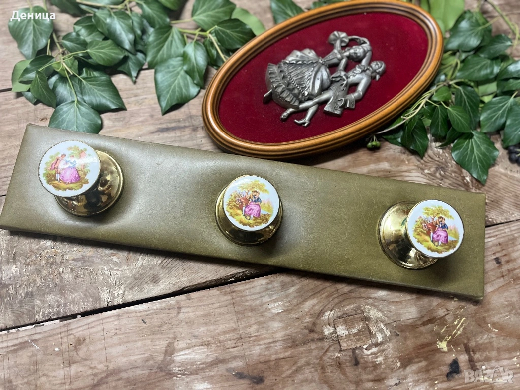 Винтидж стенна закачалка с порцеланови Закачалките са с романтични сцени в стил „Фрагонар“. Основата е дървена и подплатена маслиненозелена кожа Порцеланови закачалки в стил Рококо с метална основа, която има следи от употреба
