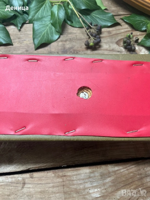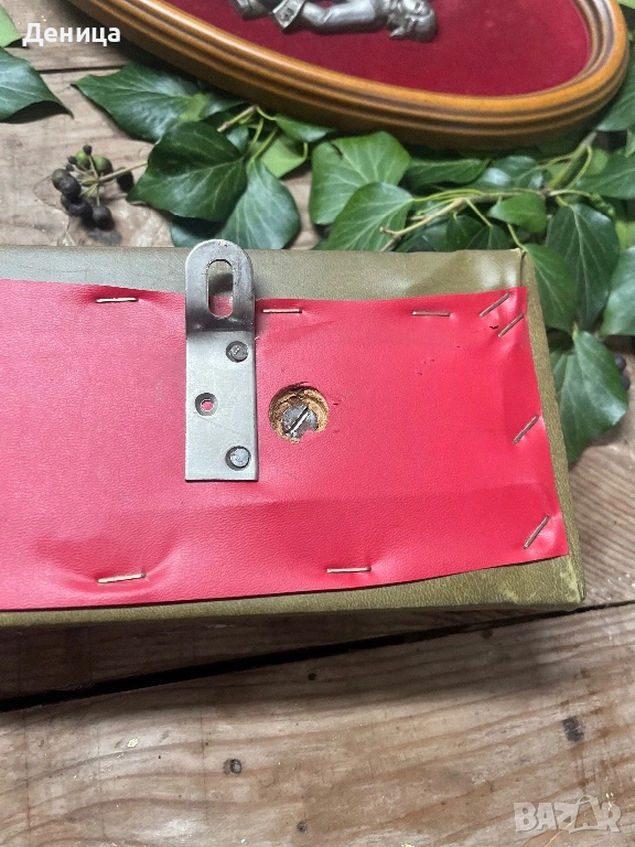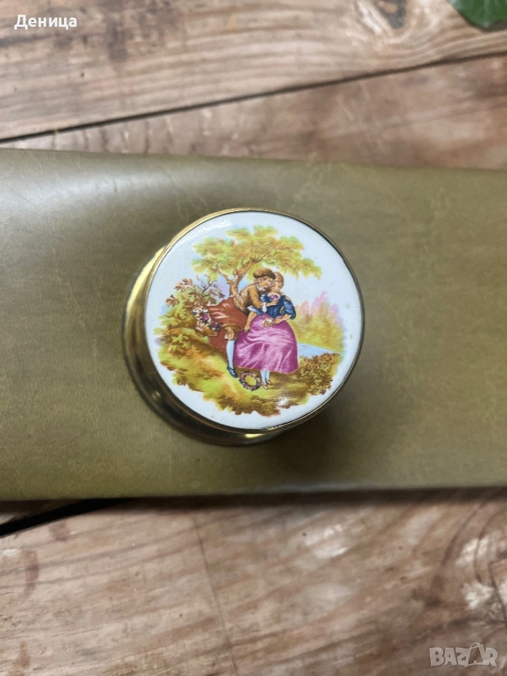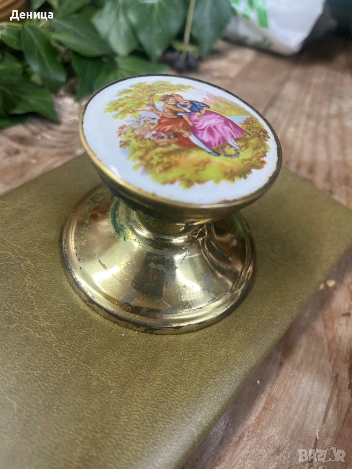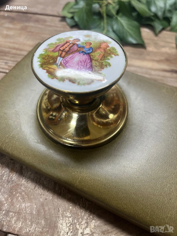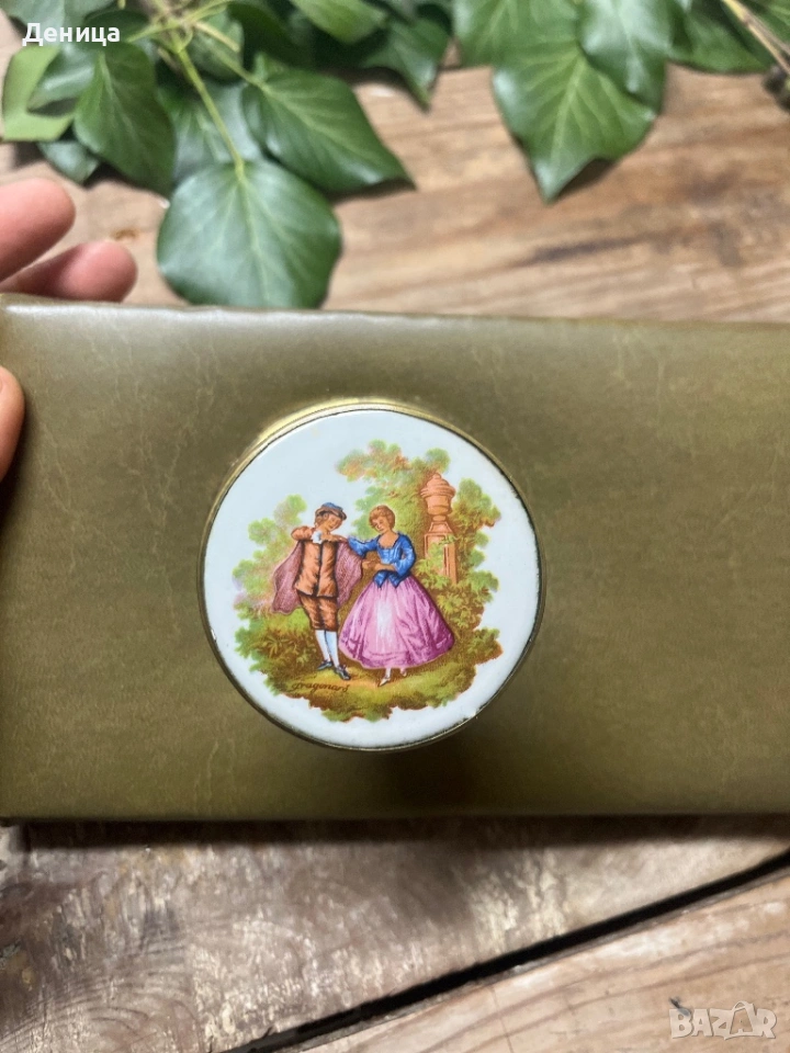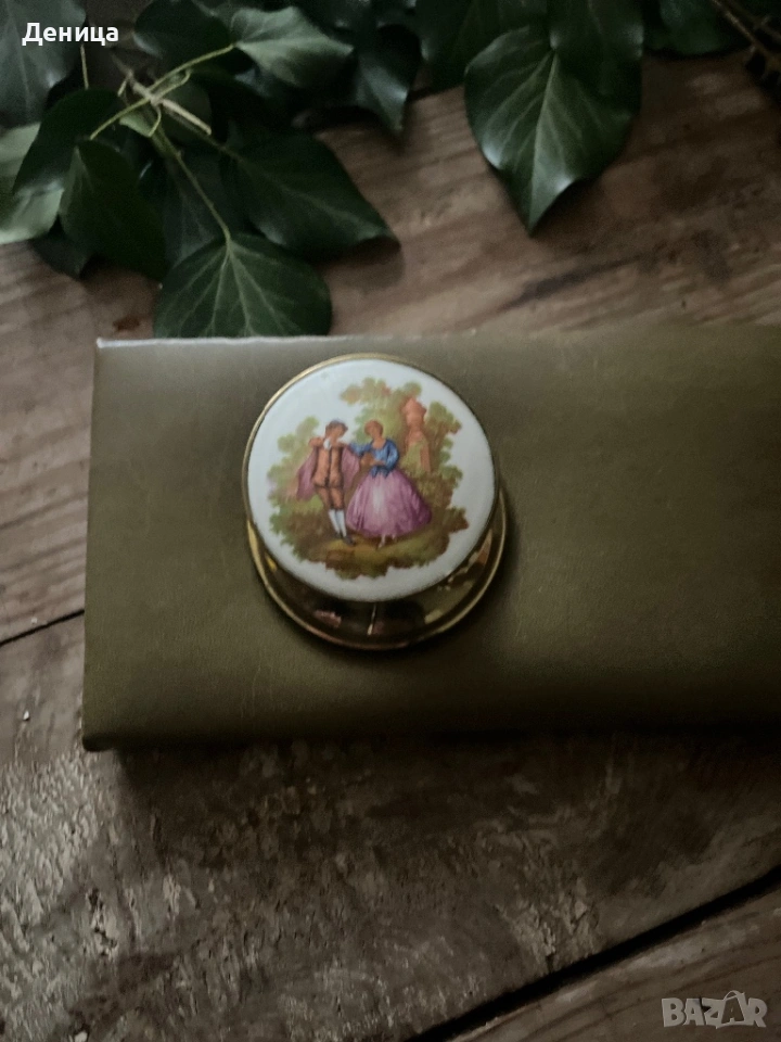 Винтидж стенна закачалка с порцеланови Закачалките са с романтични сцени в стил „Фрагонар“. Основата е дървена и подплатена маслиненозелена кожа Порцеланови закачалки в стил Рококо с метална основа, която има следи от употреба