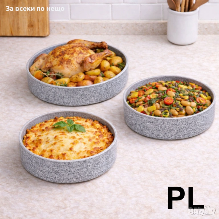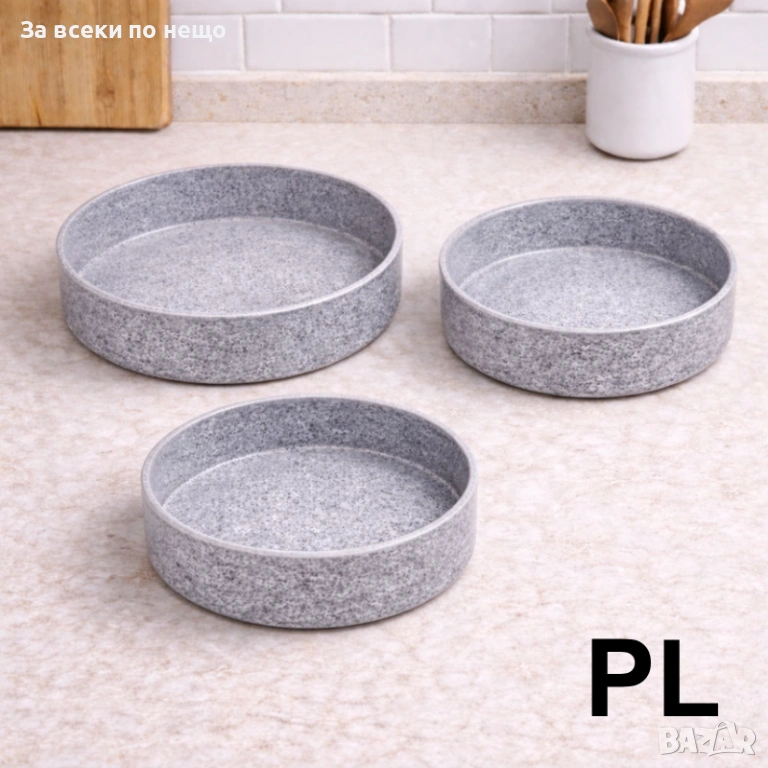 Комплектът включва 3 броя алуминиеви тави с размери: