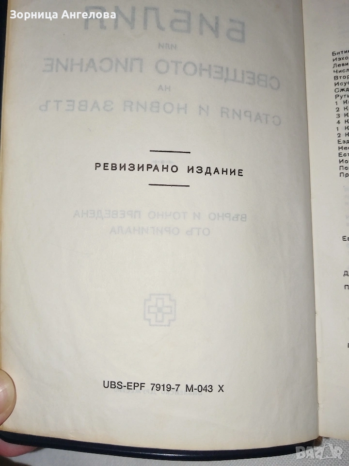 Рядко срещана протестантска Библия (Стар и Нов Завет), стар правопис, издание на Библейско Дружество / United Bible Societies, код UBS-EPF 7919-7 M-043 X. Ревизирано издание. Период 70 те. На едно място има писано с химикал, видно на снимките.. Изключително Запазена. Твърди корици от висококачествена изкуствена кожа. 40 ЕВРО