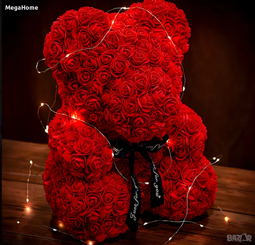 Мечето е изработено от над 150 червени рози - спомен, който ще напомня винаги за Вас. Розите са ръчно подредени и залепени една по една.