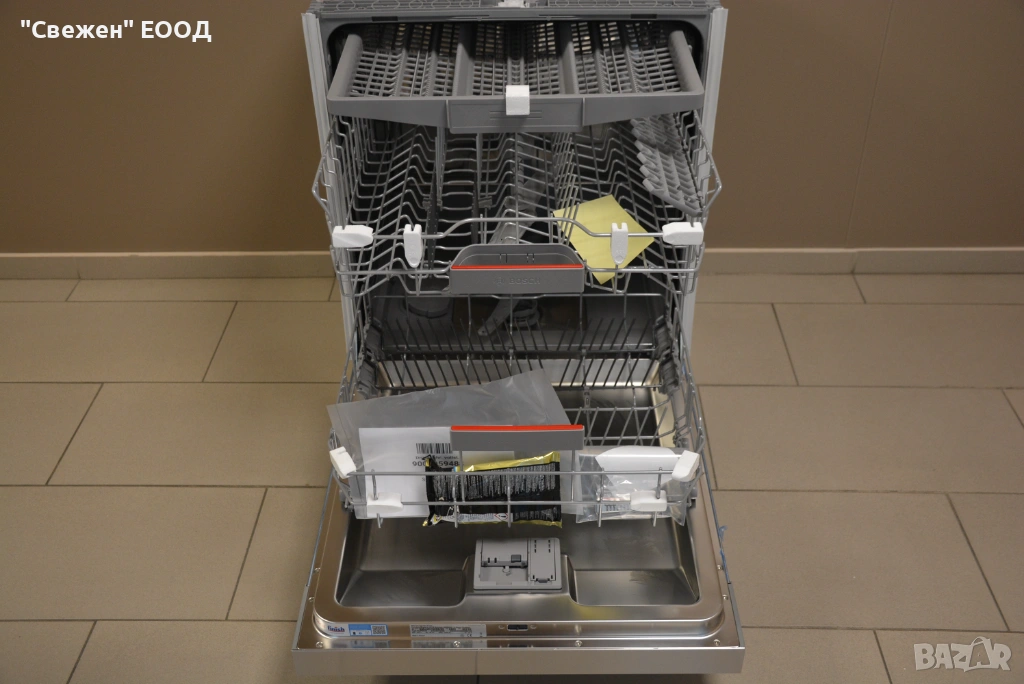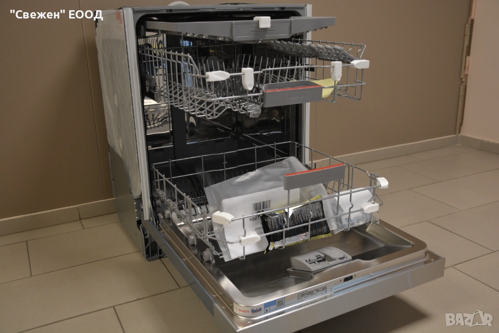 Третото чекмедже е отделно, плоско пространство в най-горната част на съдомиялната, предназначено за прибори, дребни аксесоари и малки чашки, което оптимизира използването на вътрешния обем. Това позволява традиционната кошница за прибори в долния рафт да бъде премахната, освобождавайки място за повече чинии, тенджери и тави. Приборите се подреждат равномерно, без да се допират, което гарантира по-ефективно миене и предотвратява надраскване. Чекмеджето е проектирано така, че побира както стандартни вилици и лъжици, така и по-големи кухненски аксесоари като черпаци, бъркалки или малки капачки. В някои секции има гъвкави елементи, които могат да се свалят или сгъват при нужда. Тази система подобрява организацията, улеснява разтоварването и увеличава капацитета на машината.