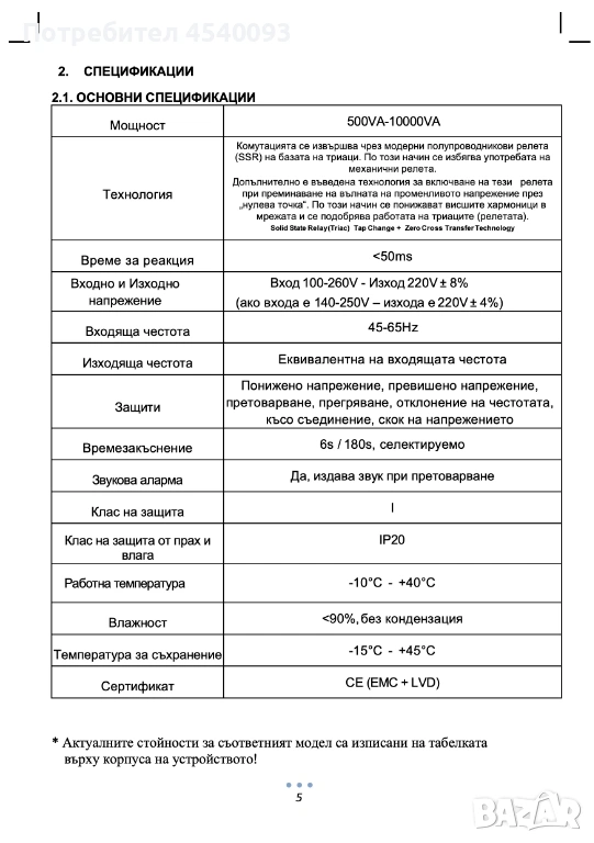 10KVA(8KW) ЕЛЕКТРОННИ МОНОФАЗНИ АВТОМАТИЧНИ СТАБИЛИЗАТОРИ/РЕГУЛАТОРИ/ за ток и напрежение VITOLUX с напълно Електронно управление. Информационен Цветен LED дисплей, изцяло метален кожух, за стенен монтаж, или свободно подово стоене/по избор/. Предимството на елктронните стабилизатори е, че изправят тока моментално, без никакво закъснение - имат 0 секунди за реагиране/Zero Cross Transfer Technology/. Осигуряват 230 волтово стабилно захранване на LCD , Plasma телевизори, компютри, непрекъсваеми захранвания (UPS-и) и всякаква друга прецизна апаратура. Изключително Голям диапазон за Автоматично Регулиране на входното напрежение: 100V-260V. Изходното напрежение е постоянно 230V/50Hz. чиста синусоида, с висока прецизност. Подходящи са за употреба в региони, където напрежението на електропреносната мрежа е с отклонения и амплитудни колебания, или има смущения от промишлени консуматори (зони в близост до промишлени предприятия, вилни зони, селски райони) и др. ПРЕПОРЪЧИТЕЛНО е използването на стабилизаторите и при работа с генератори за ток, за да се избегнат повреди на скъпи уреди и техника. Вградени защити за претоварване, прегряване и късо съединение. Вграден вентилатор за принудително охлаждане в случай на претоварване и загряване на стабилизатора. При пад на напрежението до 100V, стабилизаторът поддържа постоянен изходен волтаж от 230V. Вградена Байпасна система за избор на режим на работа: със, или без стабилизиране на тока. Стабилизаторите предпазват от изгаряне и повреждане всички Ваши електрически уреди и системи при токови удари от електропреносната мрежа, от мълнии и т.н. Размери- Д./Ш./В.- 41/16/32см. Тегло: 21 кг.