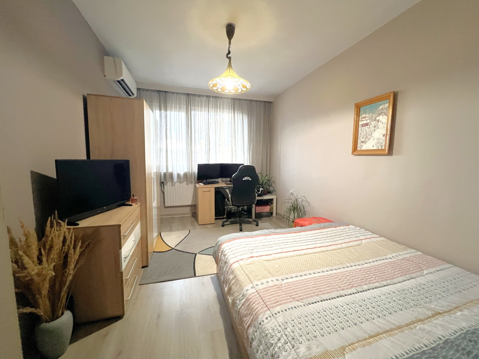 Апартаментът е много добре поддържан, ПВЦ дограма във всички помещения, ламинат в двете спални и хола, теркот в коридора. Изложение изток/запад.