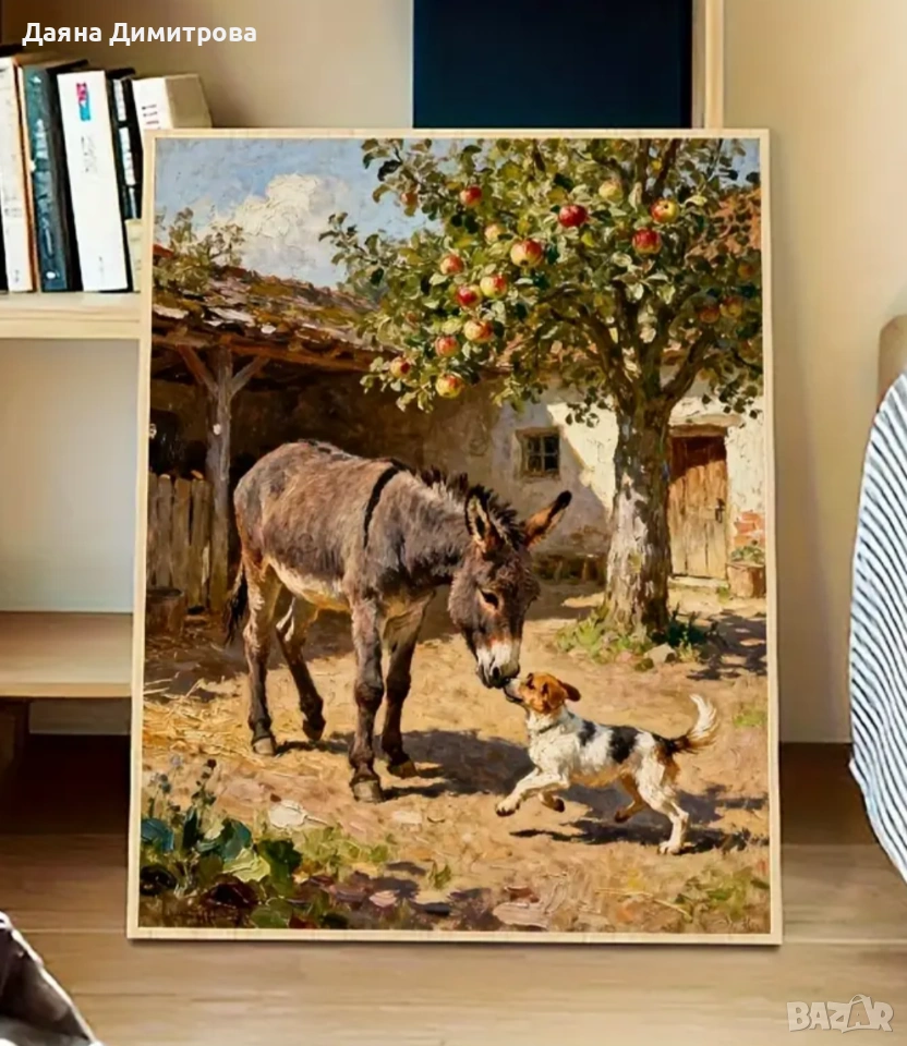 Картината представя малко магаренце и кученце, които се забавляват и играят заедно в уютен селски двор 🌾🏡. Сцена, изпълнена с топлина, живот и весели моменти, която носи усмивки и спокойствие. Идеална за дом, в който се цени уютът, радостта и приятелството между животните. 💛✨