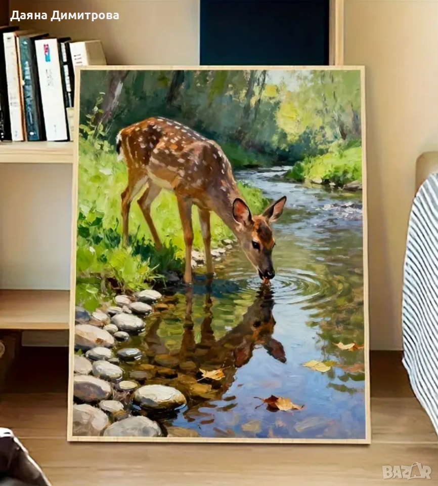 Нежна и спокойна картина, изобразяваща сърничка край река, наведена да пие кристално чиста вода. 🌊🍃 Сцената носи усещане за тишина, чистота и хармония с природата. Меките цветове и естественият пейзаж я правят идеален акцент за уютен дом, вила или офис. 🤍✨