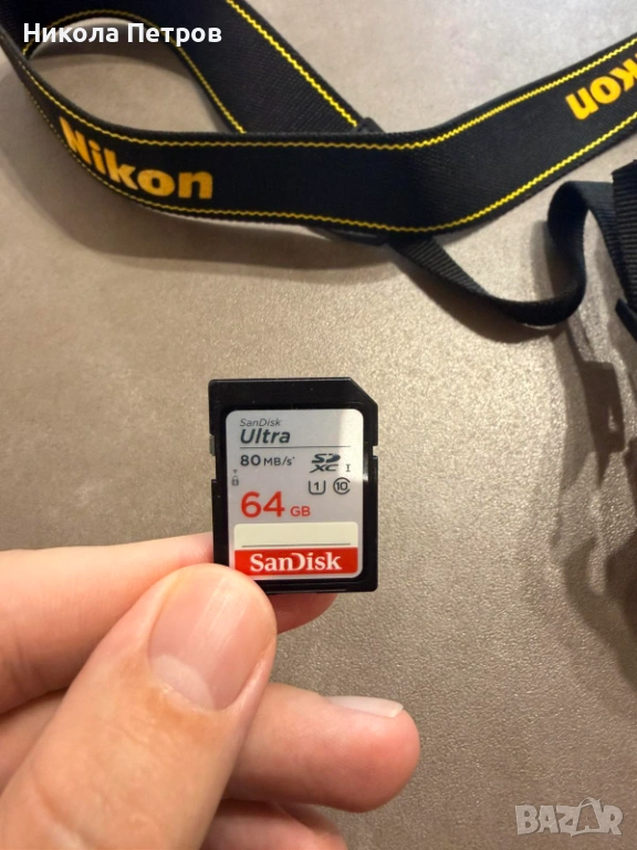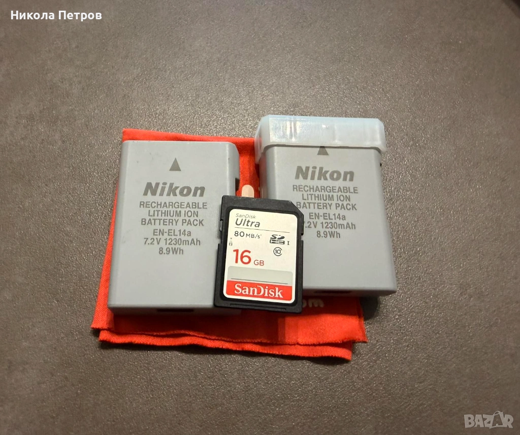 на SD карти), две SD карти (64 и 16 GB), две батерии - оригинални на Nikon и