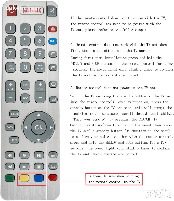 Ако телевизорът не се включи – включете го ръчно от бутона на гърба, влезте в меню “Pair your remote”, след което задръжте жълтия + синия бутон на дистанционното.