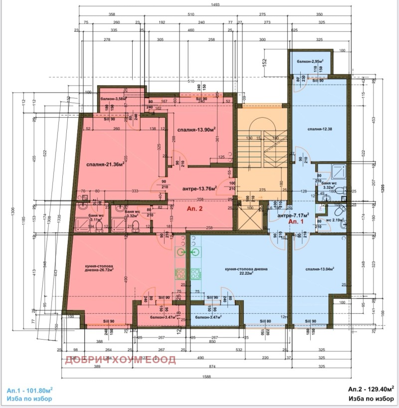 Апартамент 1: Площ от 101,80 кв.м., включващ коридор, две спални, просторна кухня с трапезария, две санитарни помещения и две тераси. Цена: 98 000 евро.