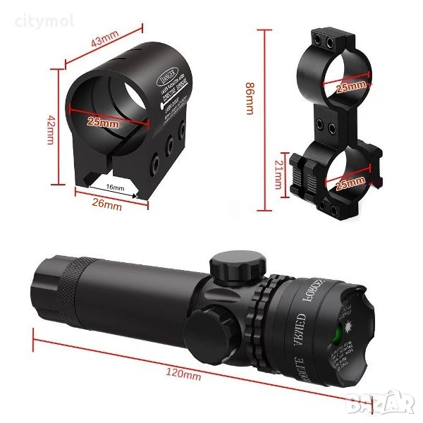 Лазерният прицел е оборудван с 2 монтажни стойки: 25-милиметрoва барел скоба с монтаж за фенер и 21 милиметров релсов държач, който може да държи лазера и да се побира на всеки 21мм ширина на тъкача.