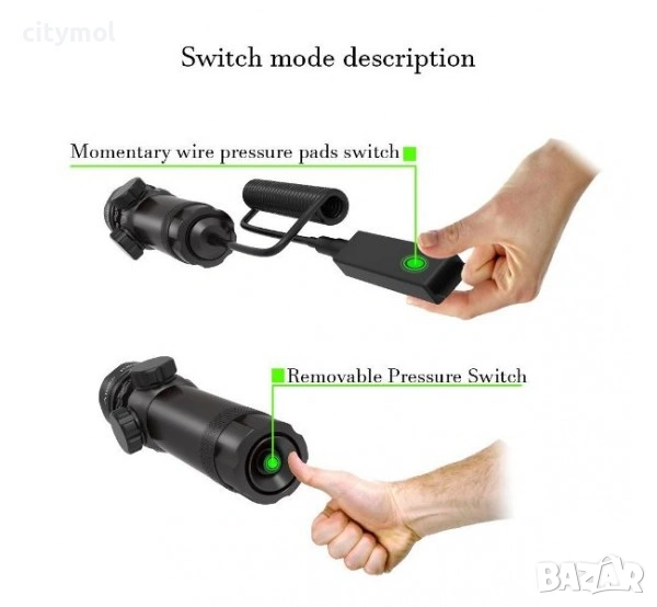 Устройството е с 2 режима на превключване- с бутон в задната част на лазерния прицел и ли чрез сменяем превключвател /дистанционен бутон/, който позволява на потребителя да използва от разстояние.