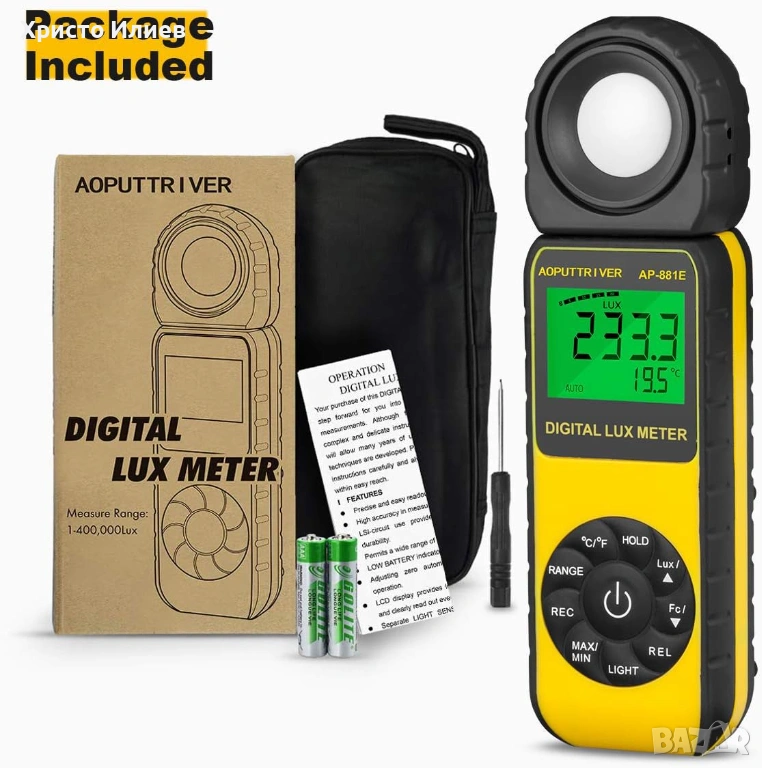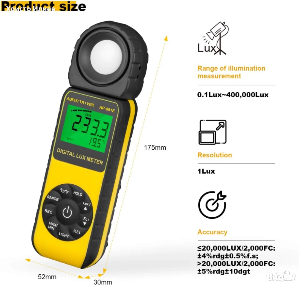 - Професионален LED светломер се предлага с широк диапазон на измерване 0,1 - 300 000 Lux/1 - 30 000FC, така че независимо дали сте фотограф, дизайнер или любител на растенията, светломерът AOPUTTRIVER ще отговори на всички ваши изисквания.