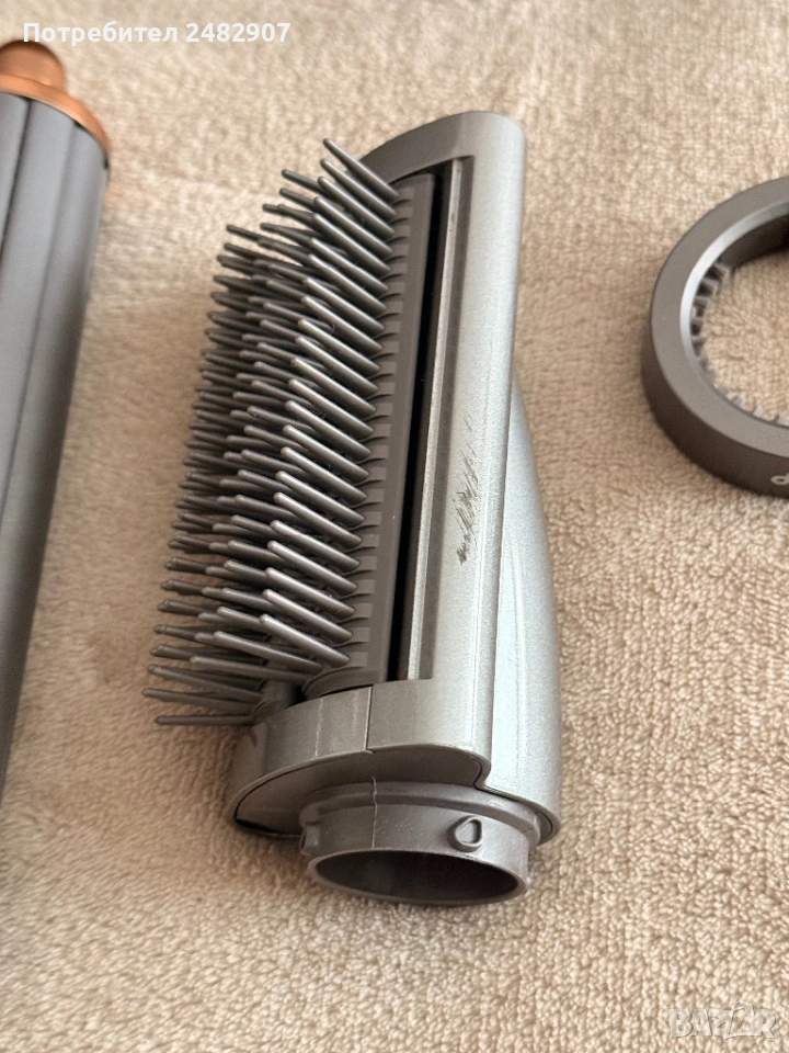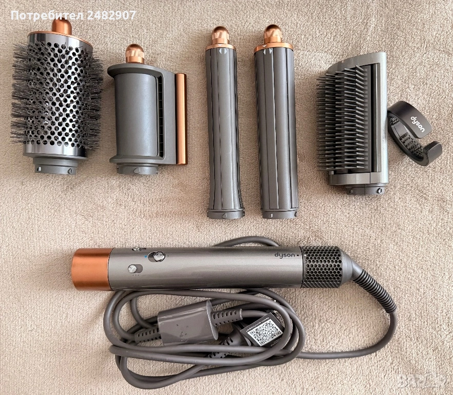 Комплектът включва: основно тяло, голяма кръгла четка за обем, приставка за предварително изсушаване, 2 броя дълги ролки за навиване, четка за изглаждане на хвърчащи косъмчета и отигинална почистваща четчица. Много запазен, много малко използван, със забележка на една от приставките, видима от снимките. Работи безупречно.