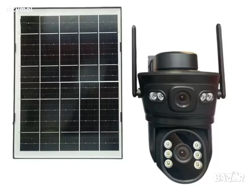 Соларна камера за видео наблюдение, със захранване от соларен (фотоволтаичен) панел. Камерата може да бъде поставена външно, без нуждата от окабеляване. Клас IP66. Прахо и влагоустоичива.