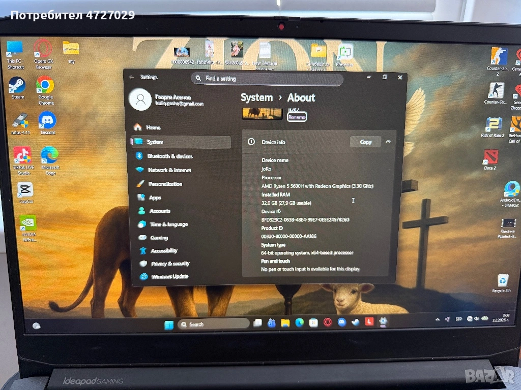 Продавам лаптоп lenovo ideapad gaming 3 32gb ram.
