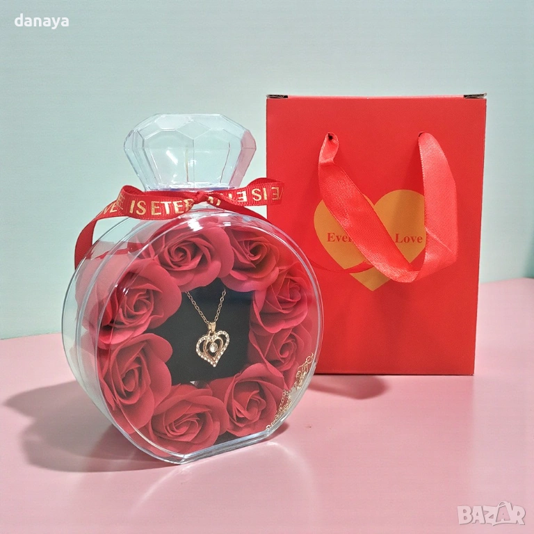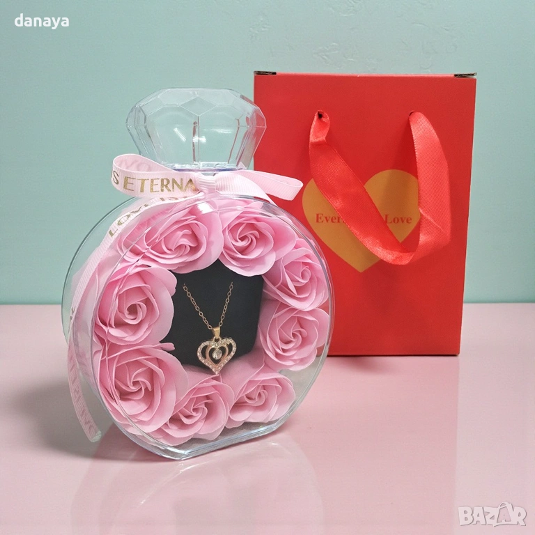 Това подаръчно колие с рози комбинира нежна визия и силно емоционално послание. В центъра на бутилката е разположено колие с висулка сърце – класически символ на любов и внимание. Декоративните рози оформят завършена композиция, която превръща продукта в готов романтичен подарък, без нужда от допълнителна опаковка.