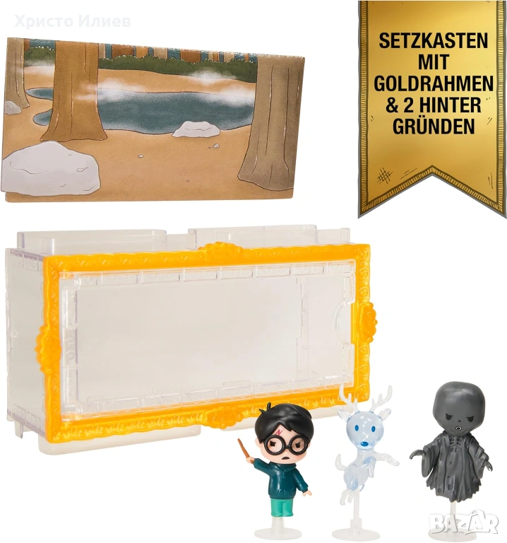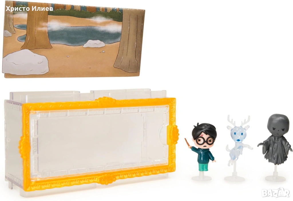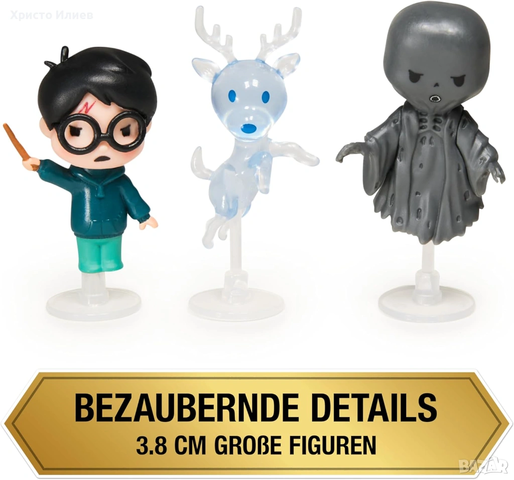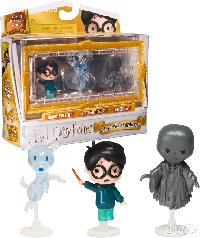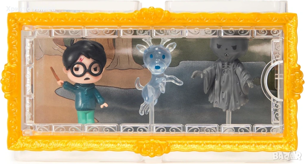 - Комплект от 3 специални фигурки на Хари Потър: съдържа фигурки на Хари Потър с мащаб приблизително 3,8 см, еленът Патронус на Хари и дементор в прозрачна витрина със златна рамка и 3 скоби.