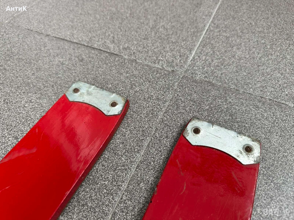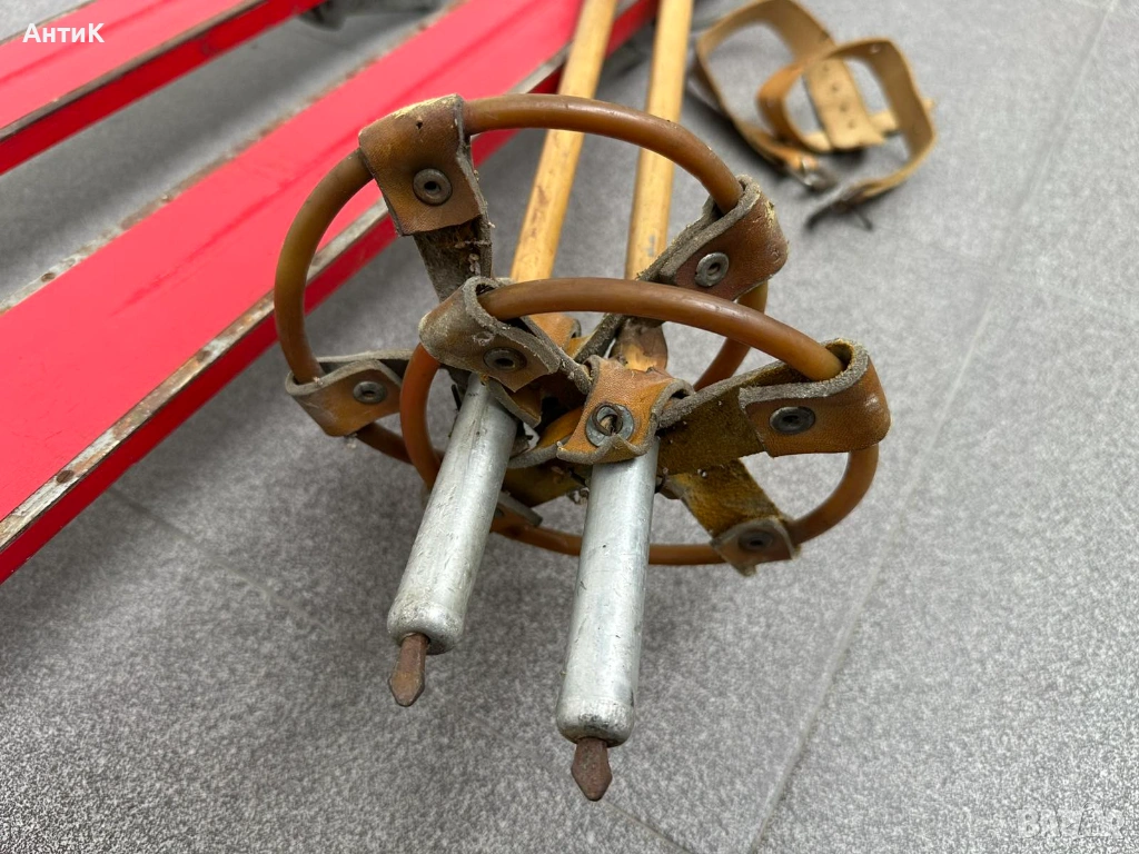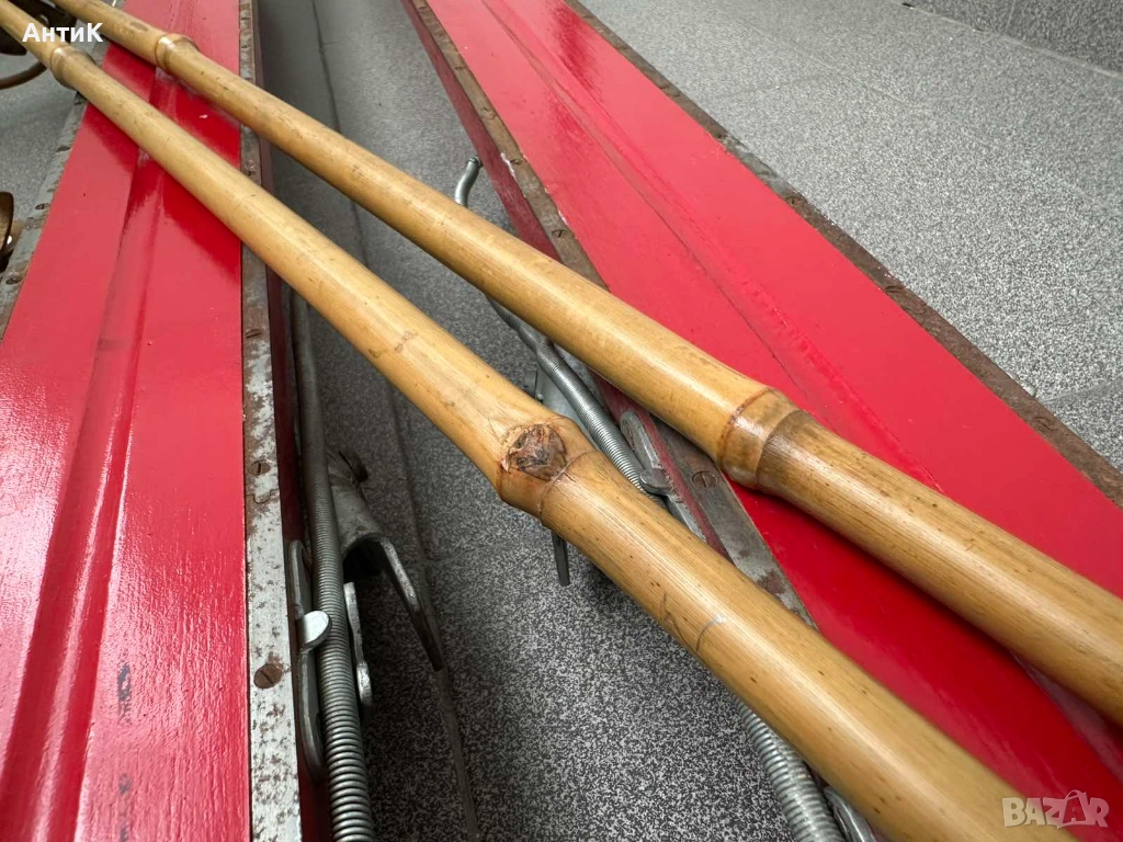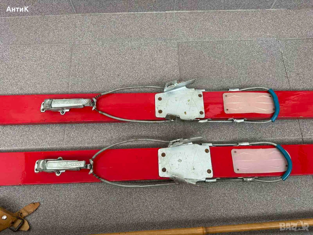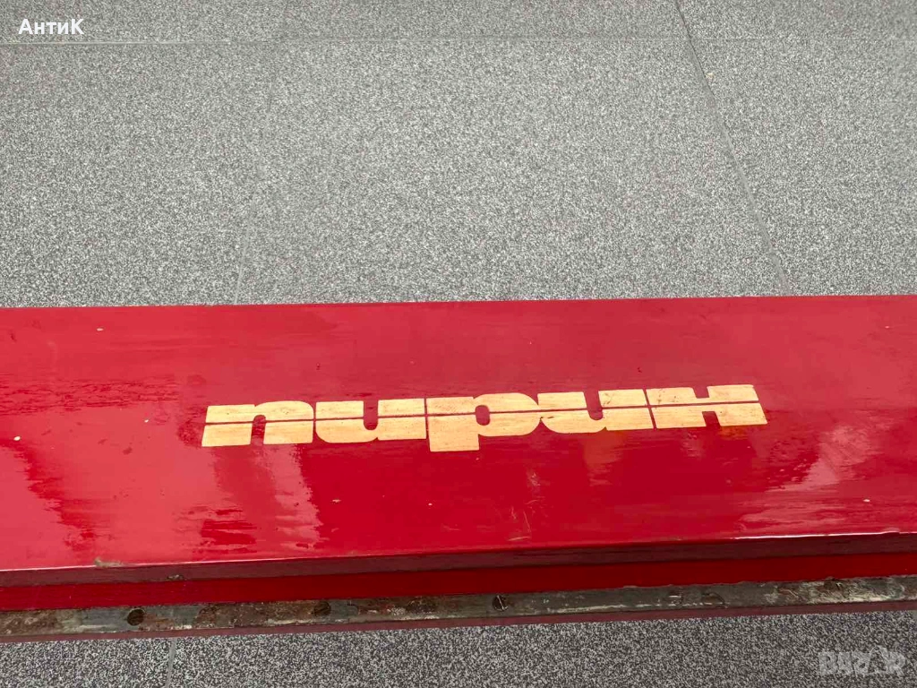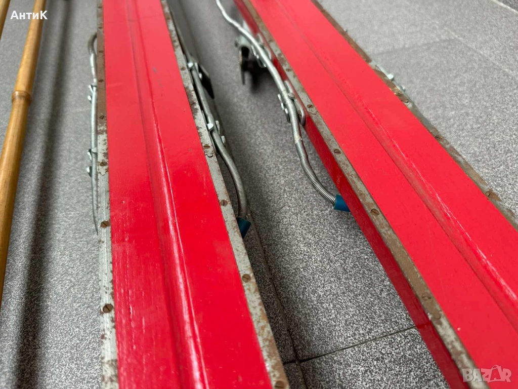 Дървени ски Пирин с бамбукови щеки. Не ползвани, както ските, така и щеките. Перфектни! Единствена забележка - повърхностна корозия по кантовете. Дължина 180см