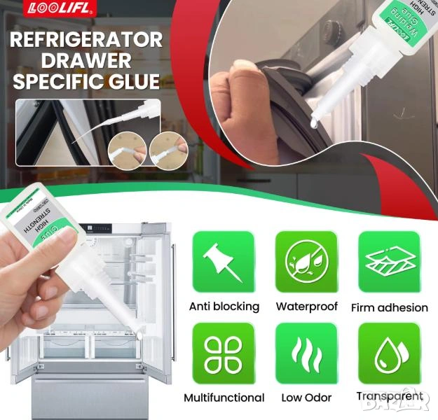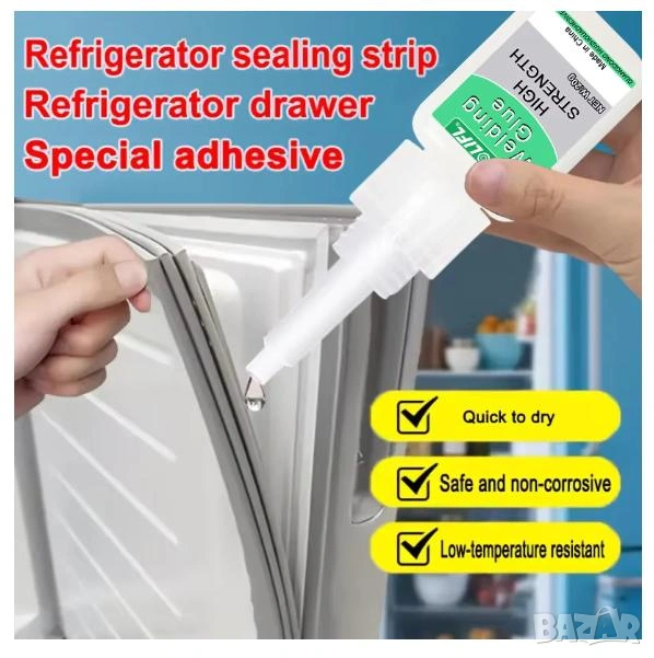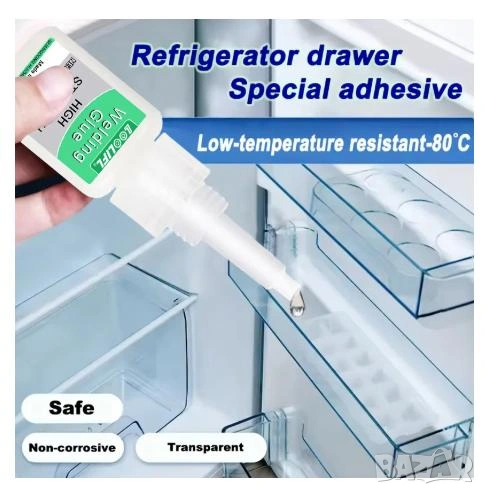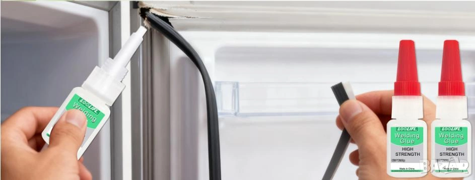 Ползвайте: Специалното лепило за хладилник, супер лепило, пластмасово лепило, уплътнение за хладилник, прозрачно, толерантност на ниски температури, антифриз.