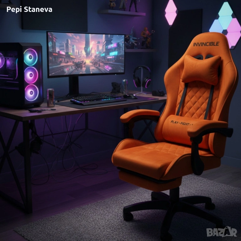 Оранжев велурен геймърски стол с поставка за крака – ергономичен, метална рамка → Обява 53334457