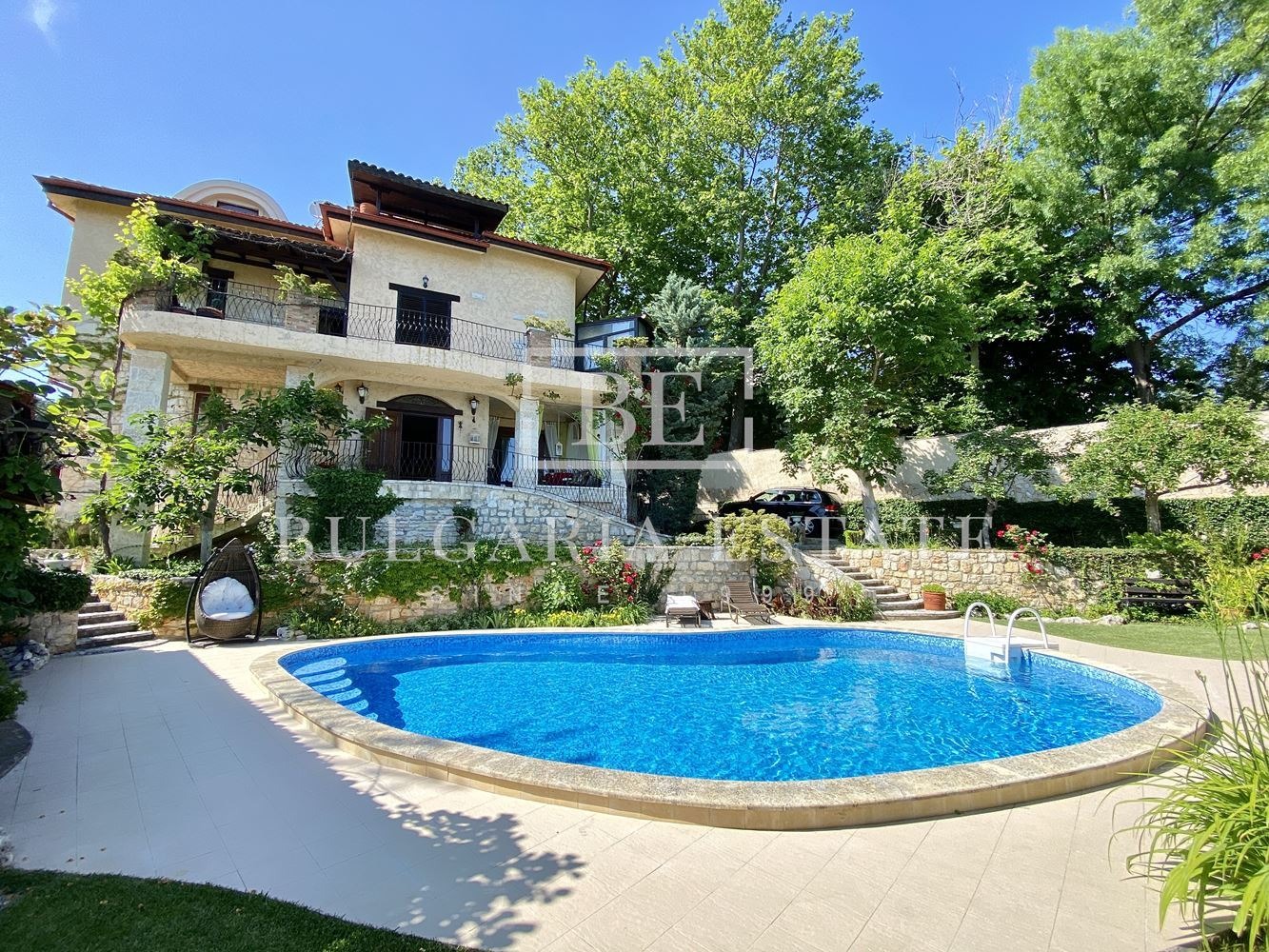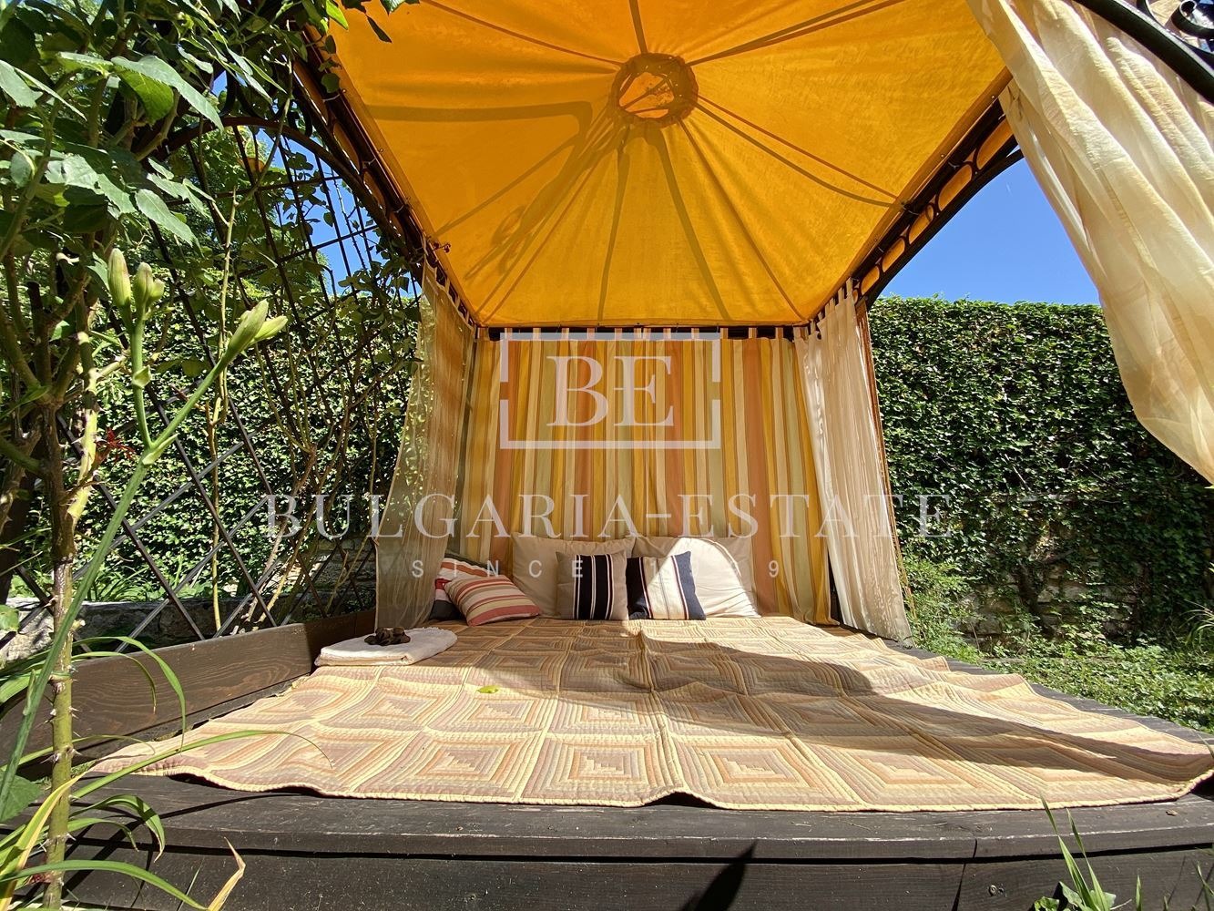 ДВОР: озеленен и поддържан безупречно, басейн, лятна кухня, лаунч зона, сауна, барбекю, паркинг.