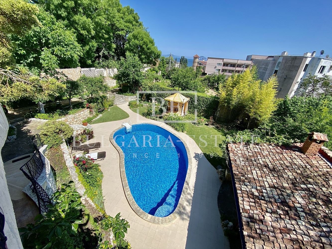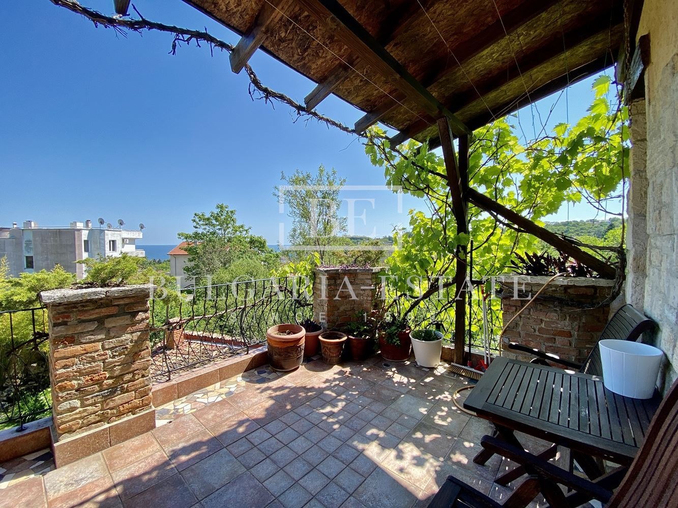 СГРАДА: Къщата представлява масивна постройка, в която са използвани естествени материали - тухла, камък и дърво. В озеленения двор е разположен басейн. Страхотни тераси с гледка към морето.