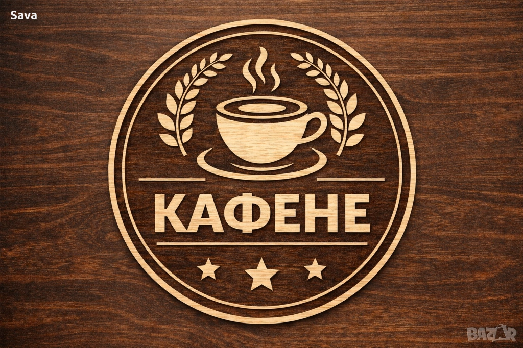 Стилна и елегантна кръгла дървена табела – лого, подходяща за кафене, бар или друго заведение. Табелата е изработена от висококачествен шперплат, с тъмен орехов фон, а всички букви и декоративни елементи са изпъкнали, в естествения светъл цвят на дървото, което създава силен контраст и премиум визия.