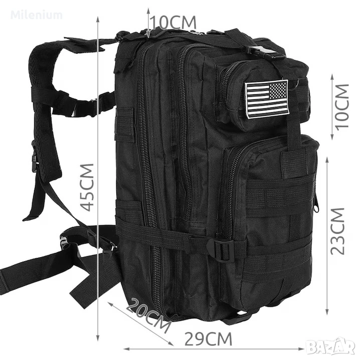 Раницата е идеална за пътувания, туризъм, къмпинг, лов, риболов и други. Изработена е от материал, устойчив на вода, скъсване и триене. Раницата разполага с дръжка, която улеснява пренасянето й.