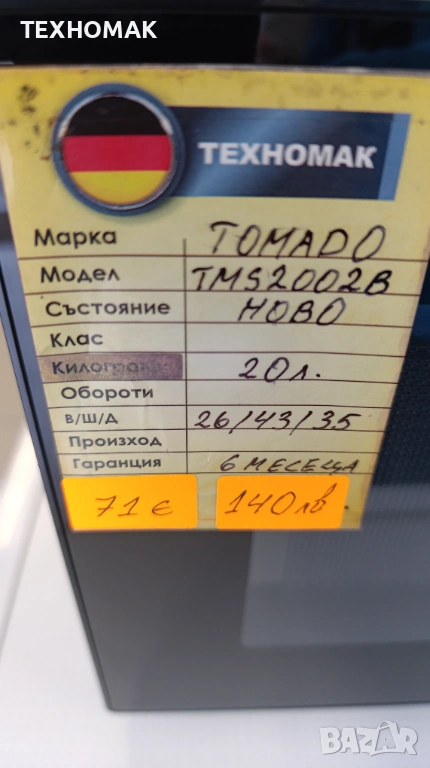 Микровълнова TOMADO внесена от Германия. Работи перфектно. Минала преглед и профилактика. Цена с 6 месеца гаранция 71 евро. Разгледайте и другите мой обяви. Адрес Гр. Варна квартал Владиславово до кметство Владиславово