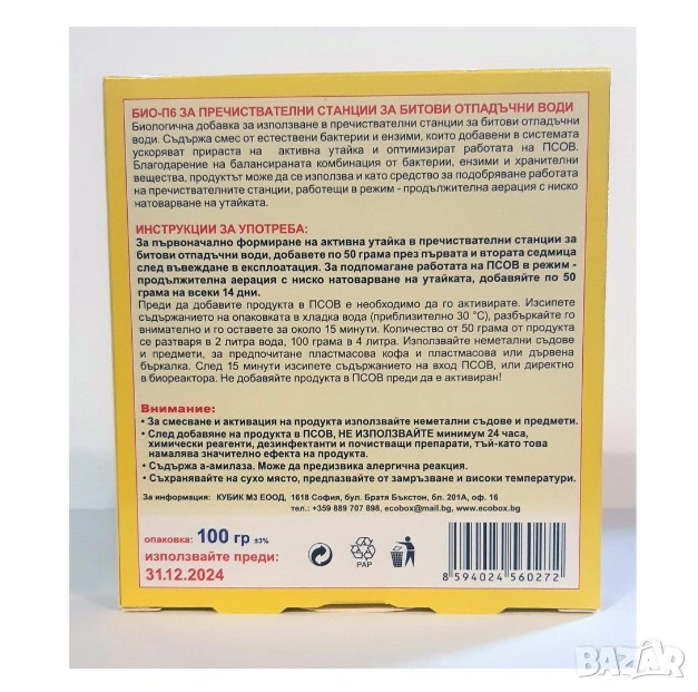 Биологичният продукт е предназначен за въвеждане в експлоатация и поддръжка на пречиствателни станции за отпадъчни води.
