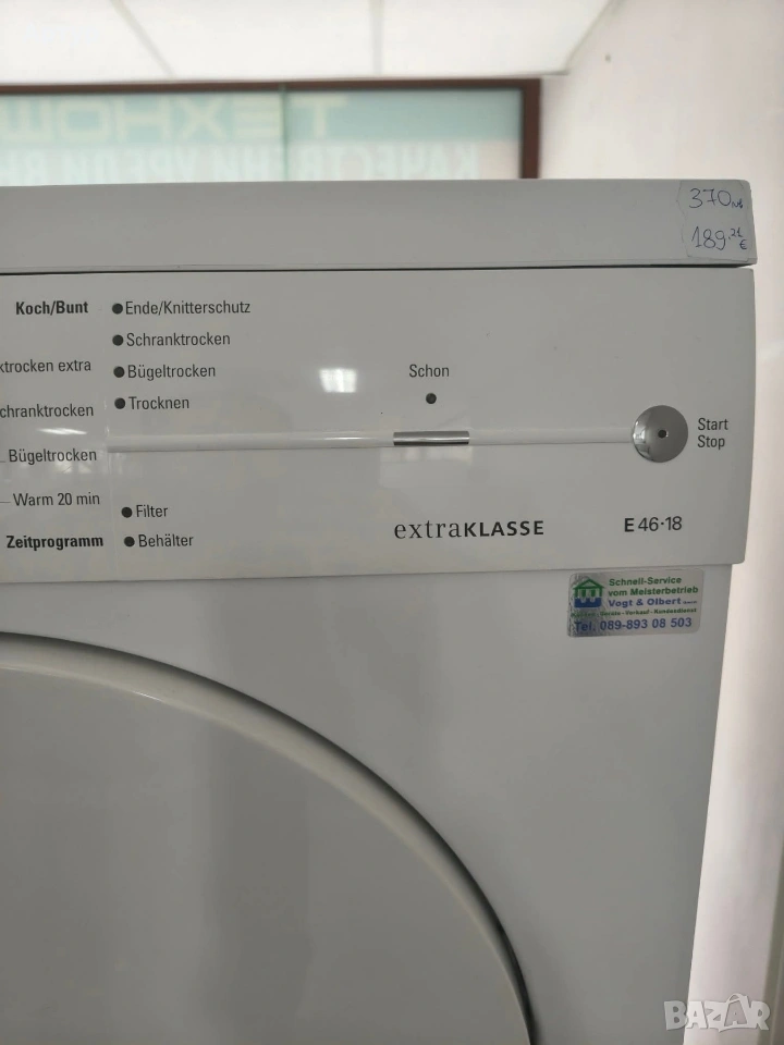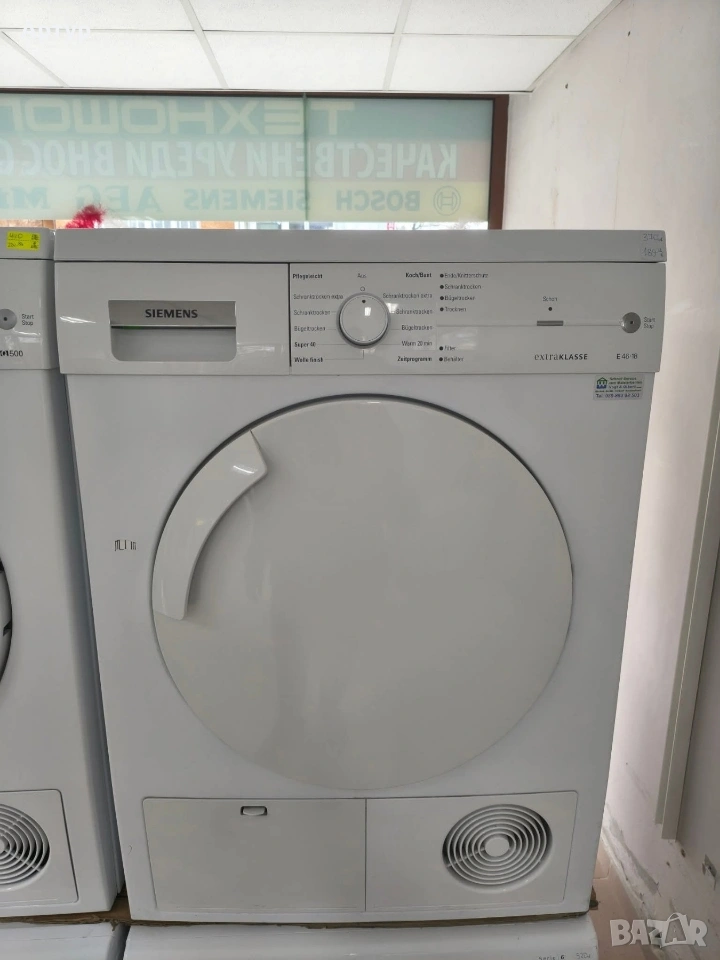 Продавам сушилня Siemens Extraklasse – E46-18 Цена: 370лв Сушилнята е в отлично състояние, напълно обслужена и тествана. Марка: Siemens Серия: Extraklasse Капацитет: 7 кг Характеристики: Програми за памук, синтетика, лесно гладене Програма "Super 40" – бързо сушене „Wolle finish“ – за вълна Защита от намачкване Регулиране на време Здрав и надежден Siemens модел Подходяща за семейства, суши равномерно и работи тихо. Заповядайте на място за тест! Техношоп 99 – ул. Славянска 8, Сливен
