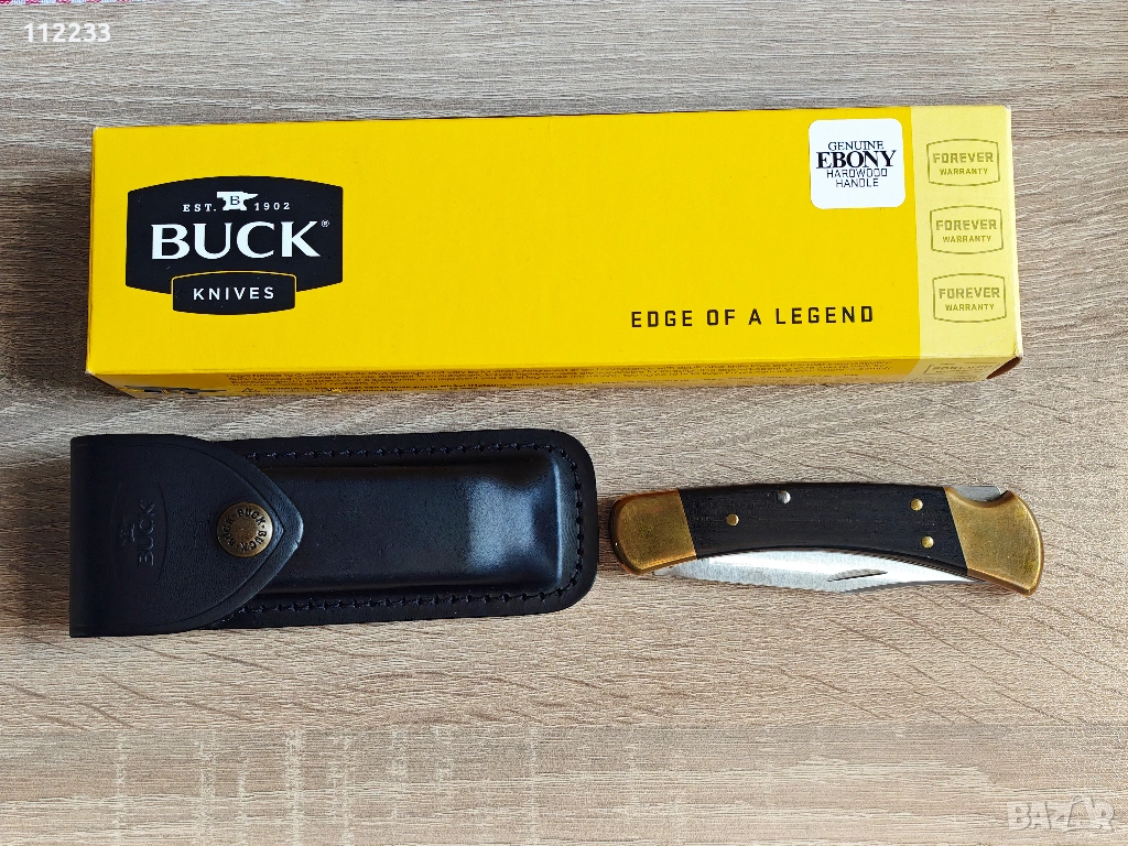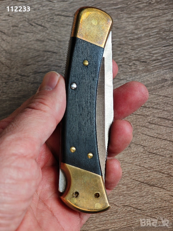 Предлагам BUCK 110 .Ножът не е използван за рязане. Стои в колекция. Месингът е придобил приятна патина,която го прави да изглежда стар. Парите са му такива,защото направих опит да разпробия дръжката,за да закача клипс. Не го направих,но все пак има наченки на пробиването(вижте на едната снимка). Предлага се с кутия и чисто нов оригинален калъф от дебела естествена кожа.