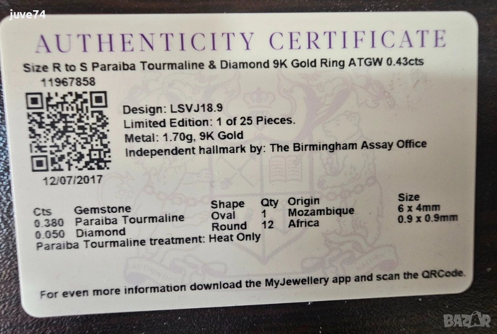 УНИКАЛЕН ЗЛАТЕН ПРЪСТЕН С ПАРАЙБА ТУРМАЛИН (МОЗАМБИК) И ДИАМАНТИ. СЕРТИФИКАТ !!! ТЕГЛО НА ПАРАЙНБА ТУРМАЛИНА-0.38 кт. РАЗМЕР-6х4 мм. РАЗМЕР НА ПРЪСТЕНА-59-60 . ВЪТРЕШЕН ДИАМЕТЪР-18.8 мм. ПРЪСТЕНЪТ Е ПРАВЕН В АНГЛИЯ И Е ОТ 9К ЖЪЛТО ЗЛАТО. ПАРАЙБА ТУРМАЛИНА Е ЕДИН ОТ НАЙ-КРАСИВИТЕ И ЦЕННИ КАМЪНИ НА ЗЕМЯТА !!! ЦЕНА-750€.