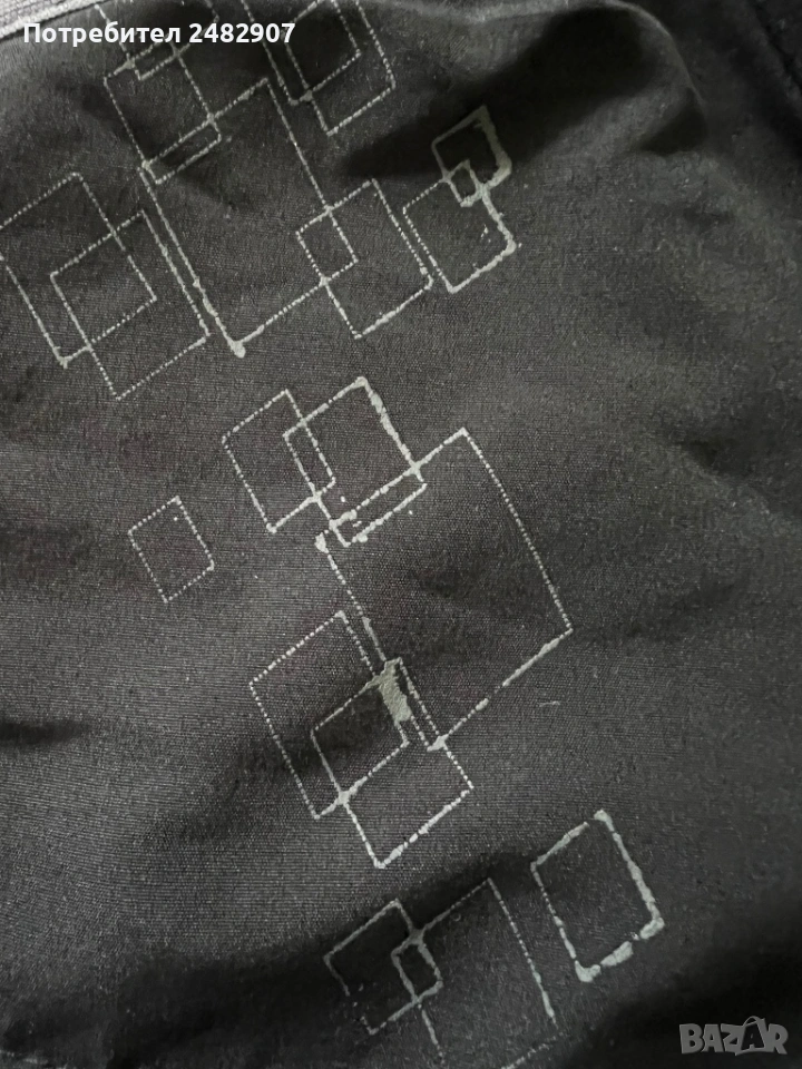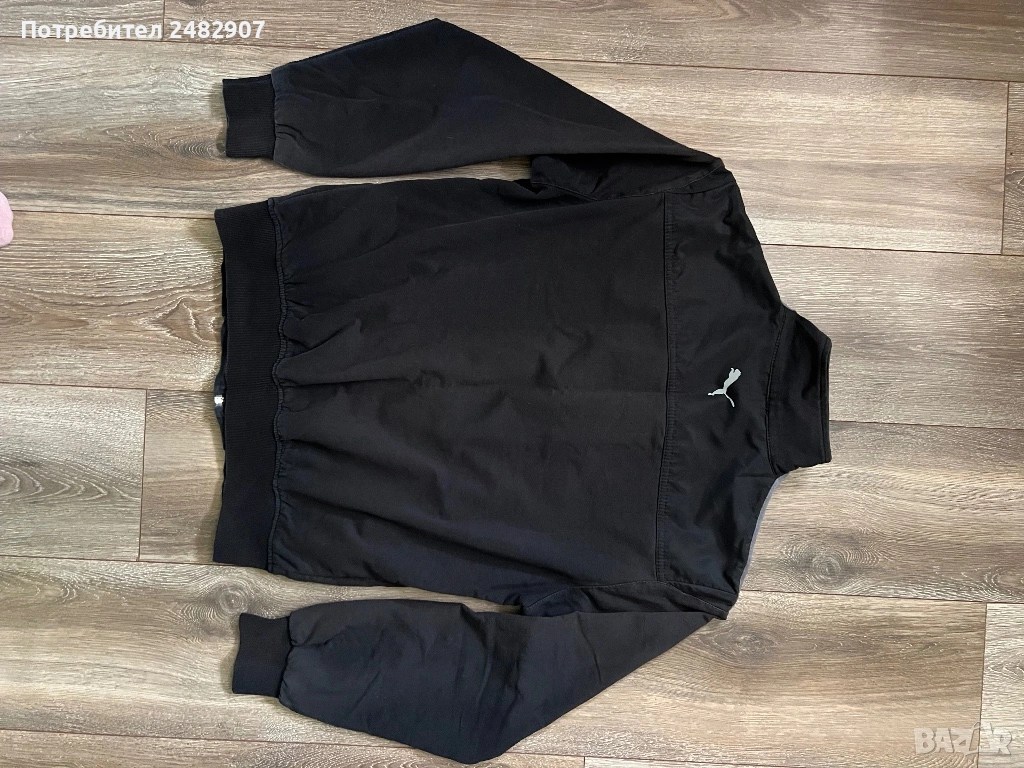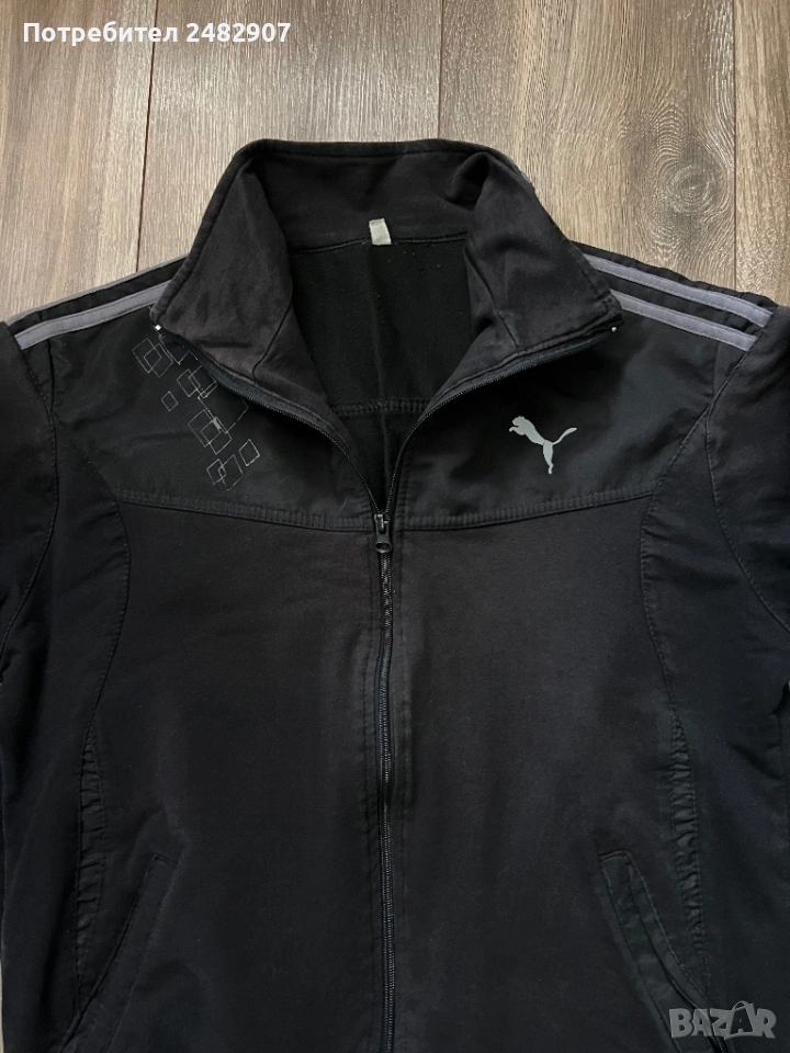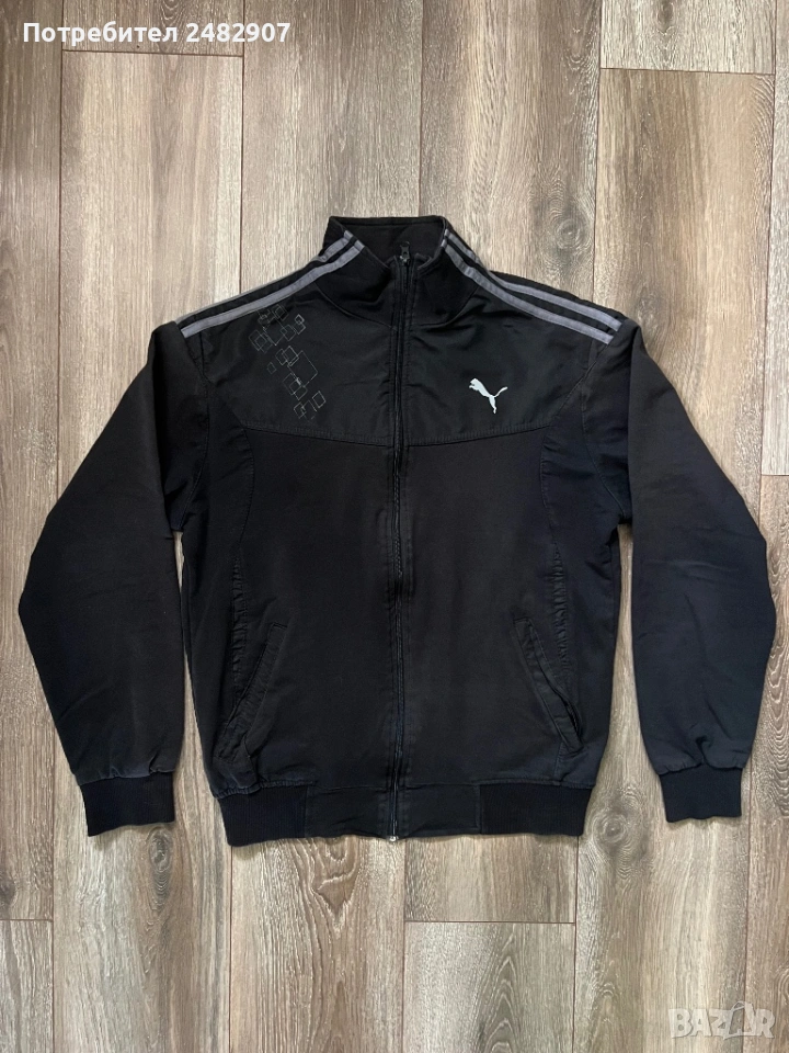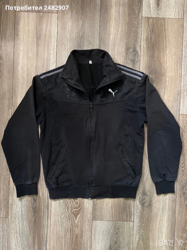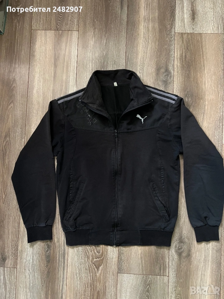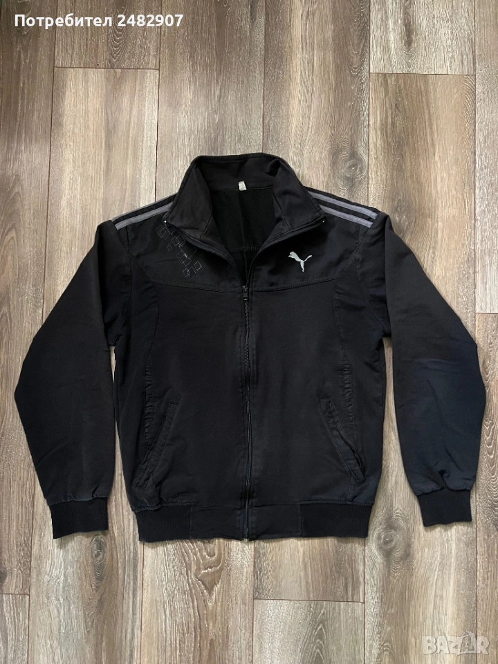 Черно мъжко горнище/Суичър, размер М. Ширина в раменете - 46 см, ширина под мишниците - 54 см, ширина в долната част - 41 см, дължина от рамото до долу - 63 см, дължина на ръкава от рамото - 60 см, ширина на ръкава в долната част - 9 см. Запазено, с нормални следи от използване, закопчаване с цип отпред и два джоба с ципове на тях.