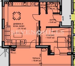 Разпределение на апартамента : входно антре (5.40 кв.м), дневна с кухненски бокс (31.10 кв.м светла площ), спалня (почти 15 кв.м), баня с тоалетна (3 кв.м), склад и прекрасна южна тераса с площ от 18.94 кв.м .