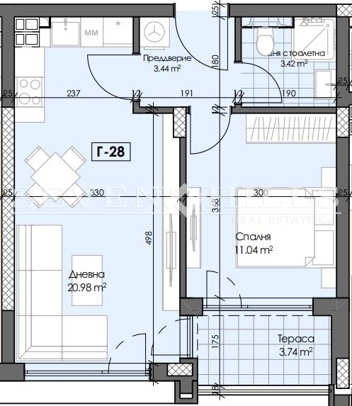 Жилището, което представяме, има следното разпределение: всекидневна с кухня, спалня, баня с тоалетна, входно антре и тераса.