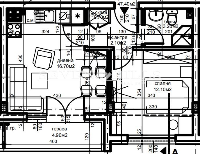 Агенция за недвижими имоти 'SEVEN HILLS' продава двустаен апартамент с обща площ от 53.91 кв.м. и застроена площ от 47.40 кв.м.