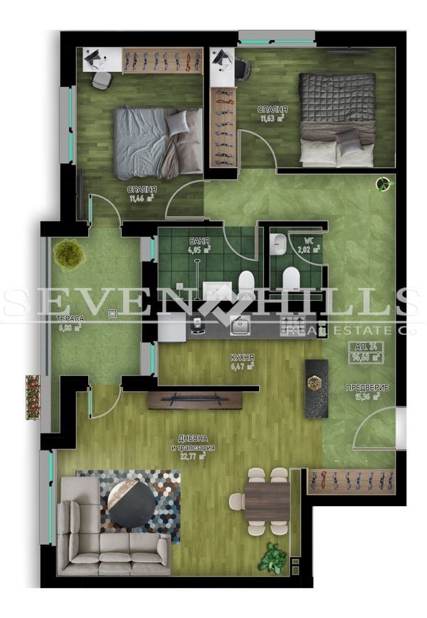 Агенция за недвижими имоти 'SEVEN HILLS' продава тристаен апартамент с обща площ от 120.74 кв.м. и застроена площ от 96.68 кв.м.