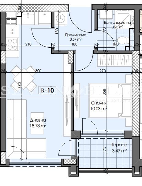 Жилището, което представяме, има следното разпределение: всекидневна с кухня, спалня, баня с тоалетна, входно антре и тераса.