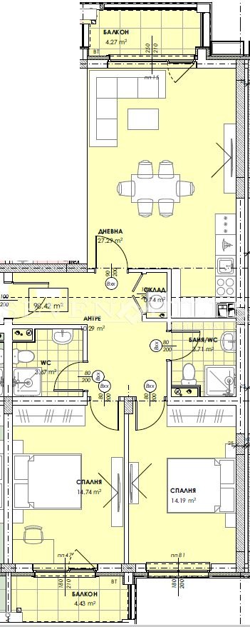 Жилището, има следното разпределение: всекидневна с кухня (27.29 кв.м.) две спални (14.74 кв.м. и 14.19 кв.м.), баня с тоалетна, втора тоалетна, склад, входно антре и две тераси с площ съответно от 4.27 кв.м. и 4.43 кв.м.