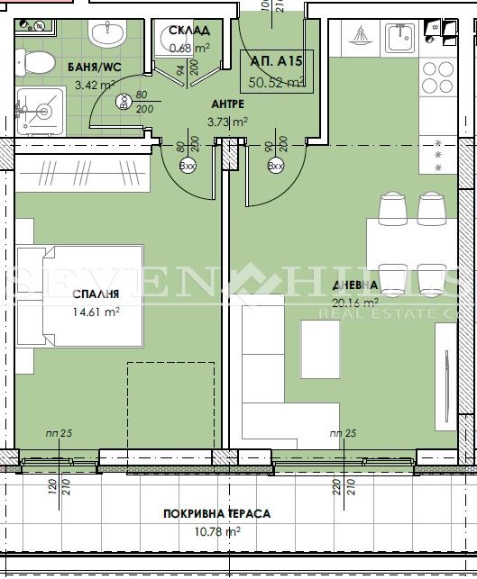 Жилището, има следното разпределение: всекидневна с кухня (20.16 кв.м.), спалня (14.61 кв.м.), баня с тоалетна, склад, входно антре и покривна тераса с площ от 10.78 кв.м.