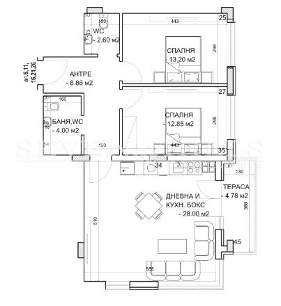 Разпределение на апартамента : входно антре 8.86 кв.м, дневна с кухненски бокс 28 кв.м , две спални по 13 кв.м ,баня с тоалетна 4 кв.м , втора тоалетна 2.60 кв.м и тераса 5 кв.м.
