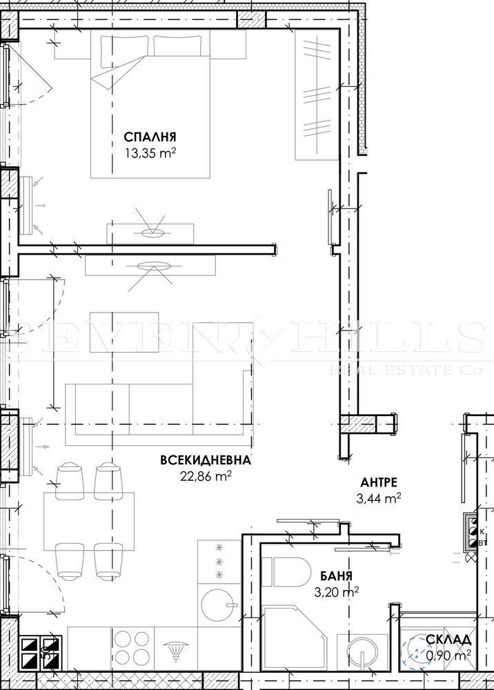Агенция за недвижими имоти 'SEVEN HILLS' продава двустаен апартамент с обща площ от 63.19 кв.м. и с 52.92 кв.м. веранда.