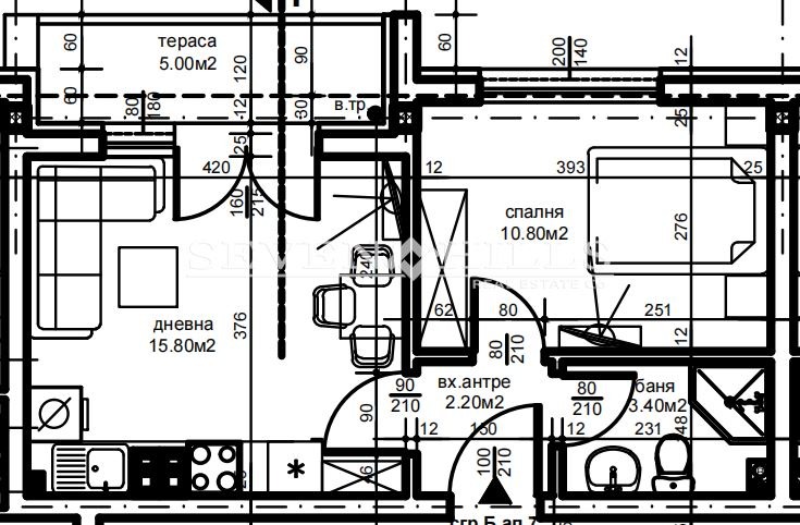 Апартаментът, който представяме, е разположен на втори жилищен етаж и има следното разпределение: всекидневна с кухня, спалня, баня с тоалетна, входно антре и тераса.