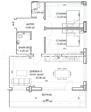 Разпределение на апартамента : входно антре 8.86 кв.м., дневна с кухненски бокс - 31 кв.м, две спални по - 13 кв.м., веранда - 15.71 кв.м, баня с тоалетна - 4 кв.м и втора тоалетна - 2.60 кв.м.