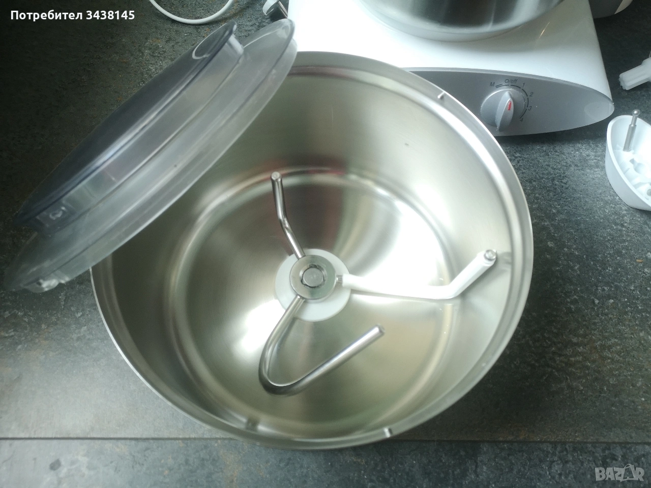 Bosch Universal Plus MUM 6N21 купа MUZ6ER1 Изключително подходящ за месене на тесто, козунак, хляб с квас -Мощност: Уредът е с мощен 1000 W мотор. -Капацитет на купата: Разполага с голяма купа от неръждаема стомана с обем 6,2 литра, подходяща за обработка на големи количества тесто (максимум 4,2 кг). -Скорости: Има 4 степени на работа, плюс функция за силен въртящ момент. -Аксесоари: Включва комплект приставки за месене и бъркане, както и приставка за миксиране/блендиране. Употреба: Подходящ е за приготвяне на различни видове теста, шейкове, сосове и супи. - купа MUZ6ER1 за месене с долна кука /бъркалка от неръждаема стомана е аксесоар, предназначен за използване с кухненски роботи Bosch Universal Plus. Този тип купа (модел MUZ6ER1) се отличава със задвижване отдолу, което работи със специална кука за тесто (както е показано на снимката), която е особено ефективна за месене на големи обеми тесто с ниска хидратация, например за хляб. Този аксесоар разширява възможностите на кухненския робот, позволявайки обработката на до 6,5 литра течности или около 12-15 фунта тесто. За София може лично предаване.