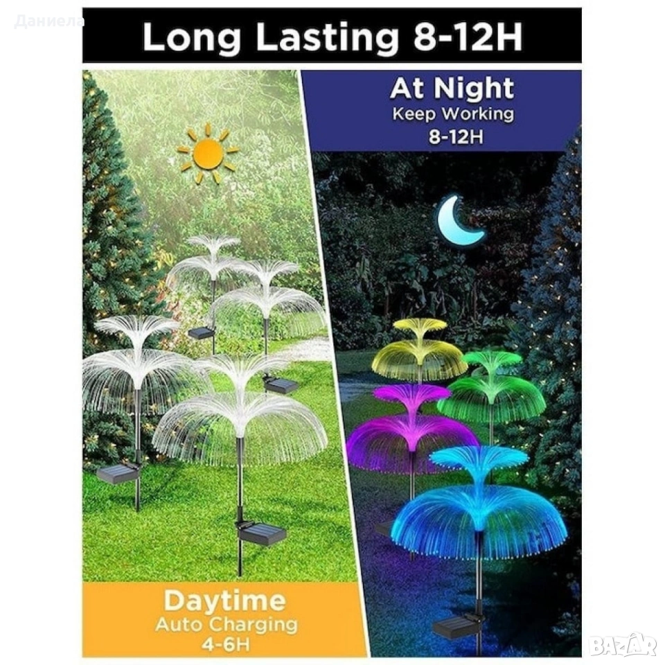 Тип осветление: RGB LED Брой цветове: 7 сменящи се цвята Захранване: Вграден соларен панел Материал: Оптично влакно и устойчива пластмаса Водоустойчивост: IP65 Автоматично включване/изключване: Да (вграден светлинен сензор) Време на работа: 8–12 часа след пълно зареждане Размери (приблизително): височина 55 см, диаметър на короната 32 см Варианти: 1, 2, 3, 4, 5 или 6 броя Варианти: 1бр.: 10€ Варианти: 2бр.: 18€ Варианти: 3бр: 24€ Варианти: 4бр: 30€ Варианти: 5бр: 35€ Варианти: 6бр: 40€